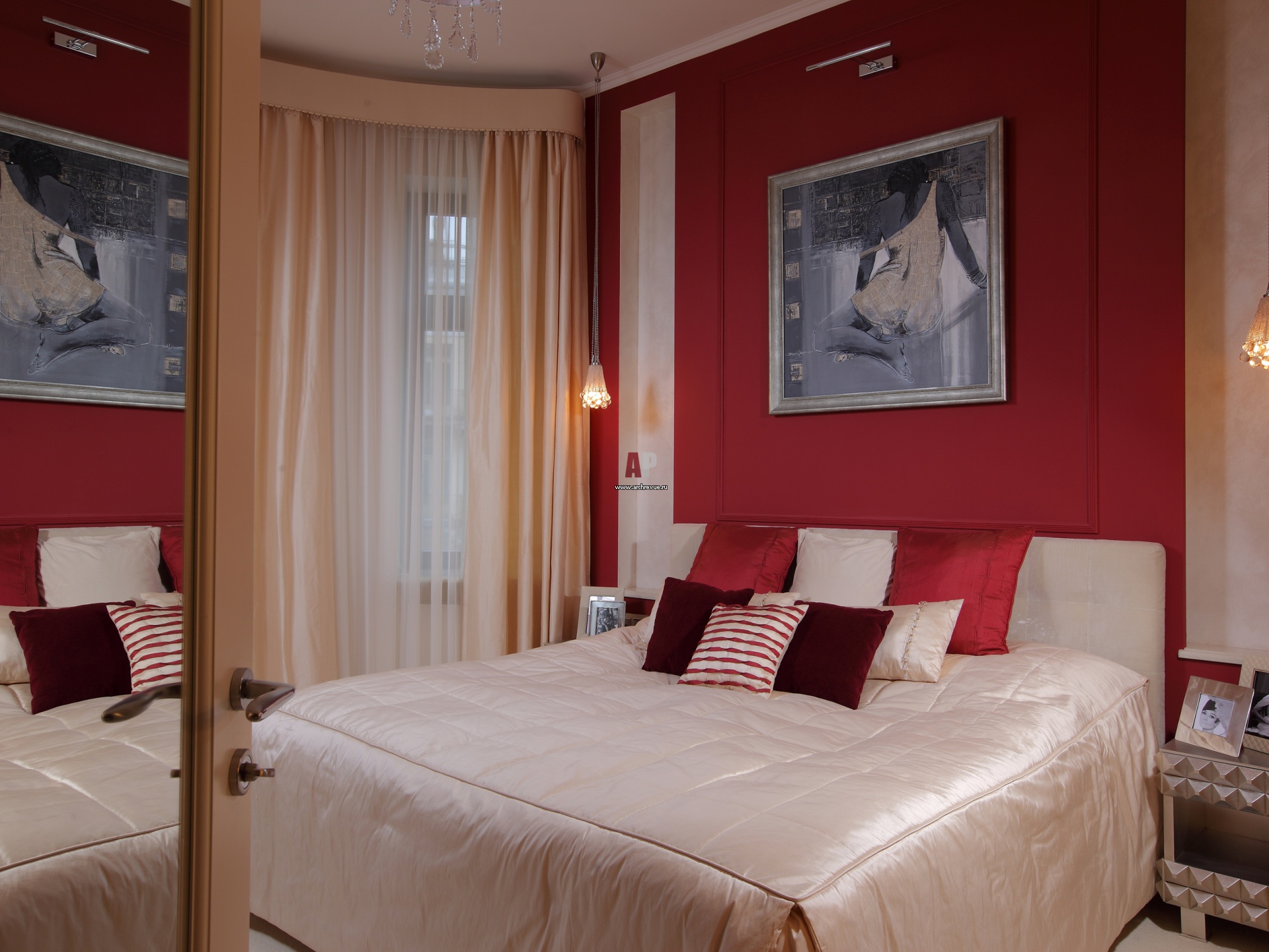 Одна из стен спальни выделена акцентным красным цветом. Он контрастирует с общей перламутровой палитрой квартиры. Напротив кровати расположены две двери: в спальню и гардеробную. Они замаскированы кожаными панелями, и их непросто заметить с первого взгляда.