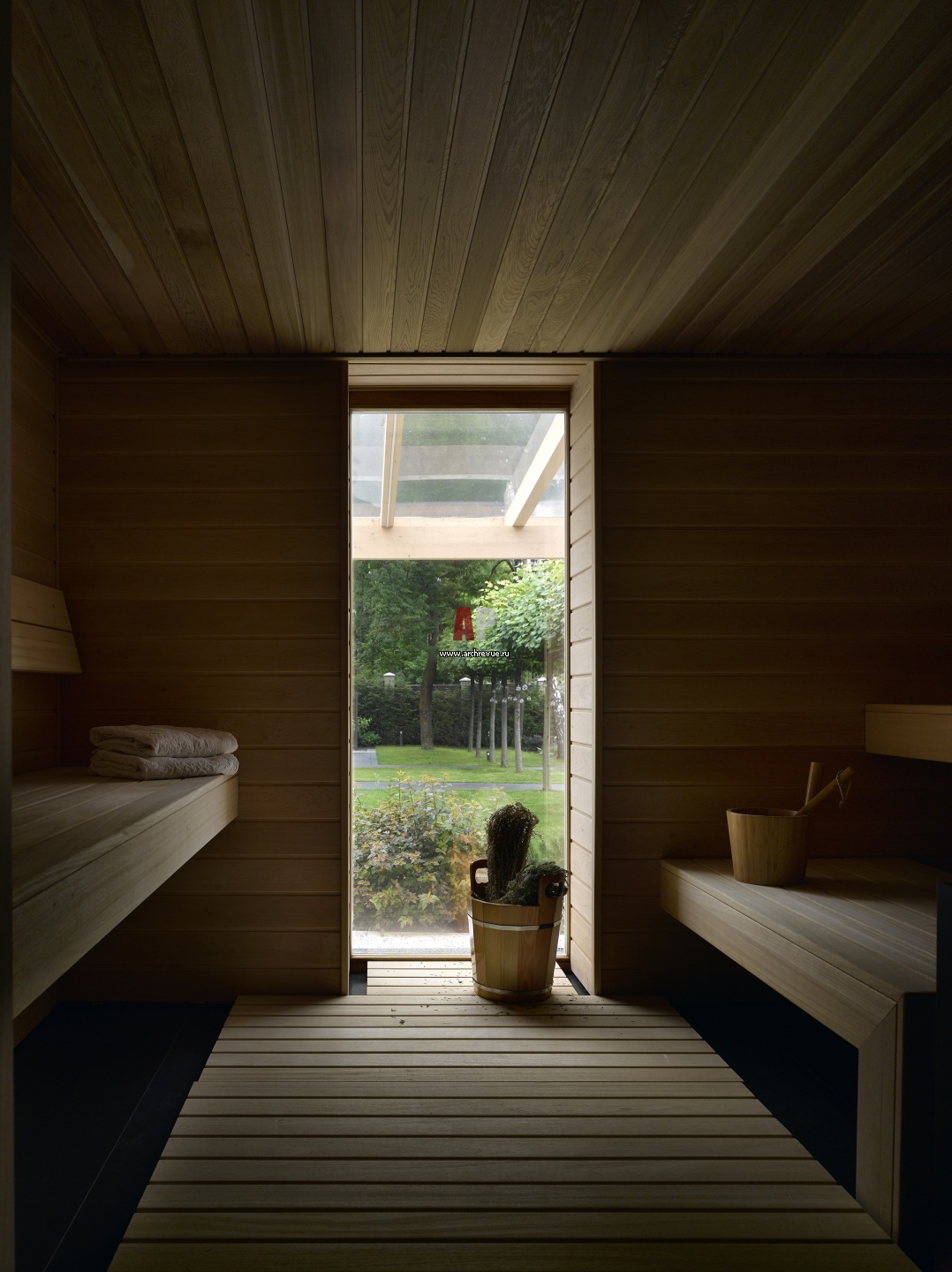 СПА-комплекс включает хаммам, душ и сухую баню. Выход из нее ведет прямо на участок.