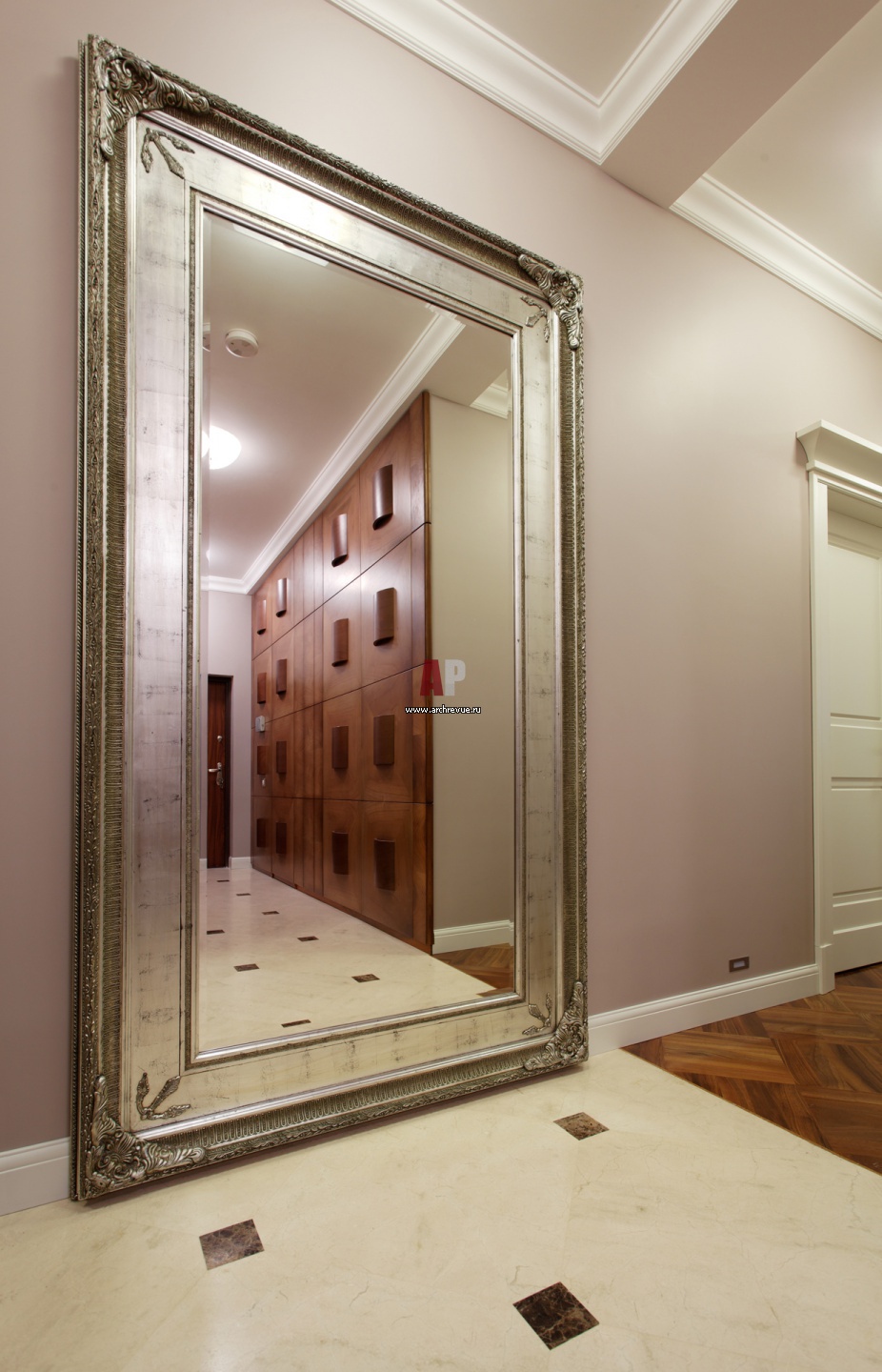 Фото отражения интерьера прихожей в высоком напольном зеркале. Рама украшена патинированным белым золотом.