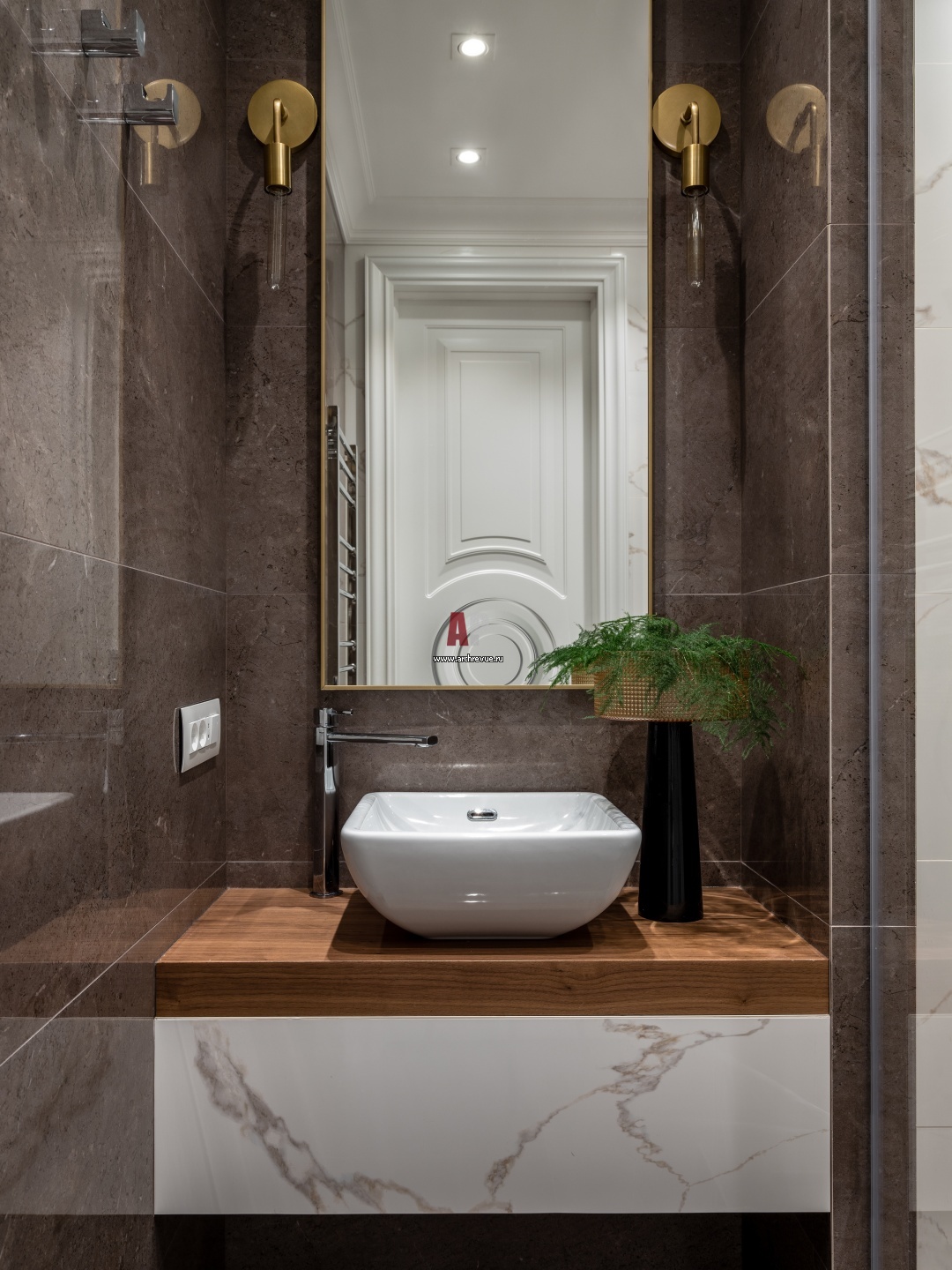 Гостевой санузел отделан деревом и широкоформатным керамогранитом, Porcelanosa. Раковина, Noken.