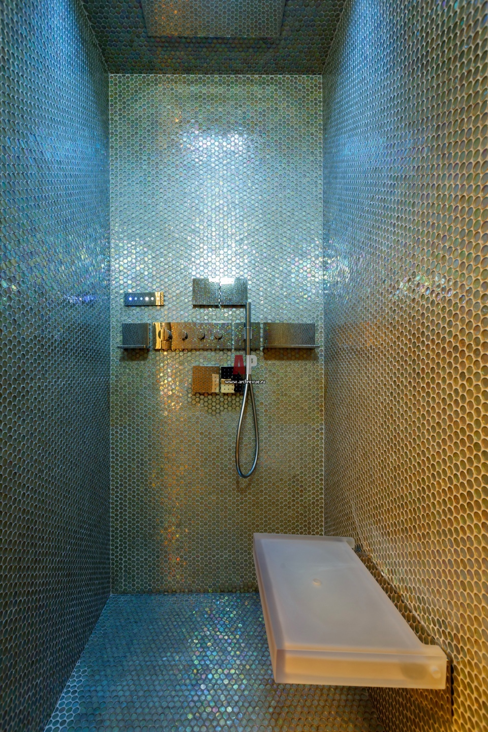 Душевая кабина в хозяйской ванной комнате облицована мозаикой из муранской смальты, Sicis.