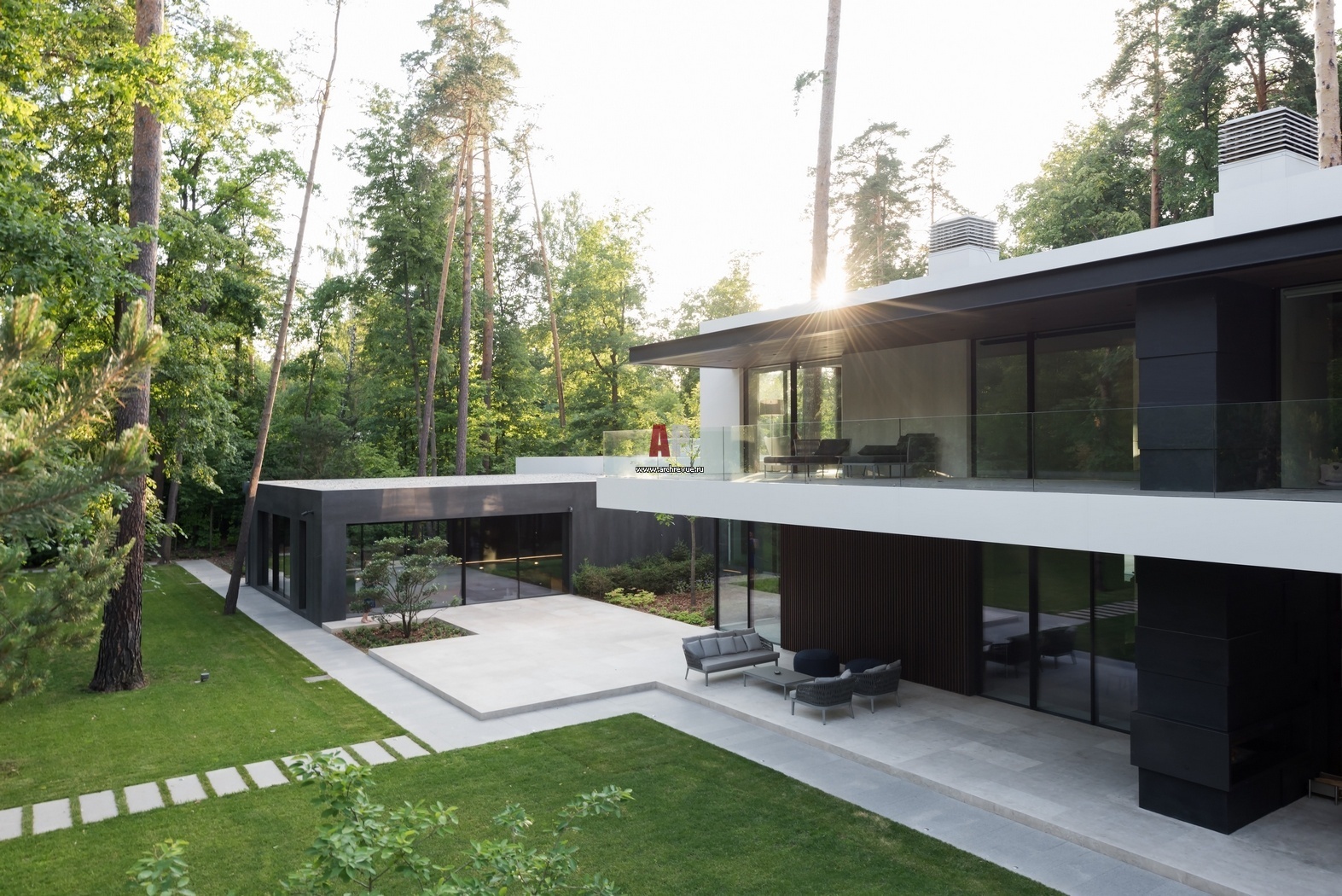 Резиденция площадью 1250 кв. м построена на участке в 50 соток. Геометрия дома подчинена задаче максимально сохранить высокие деревья на участке.