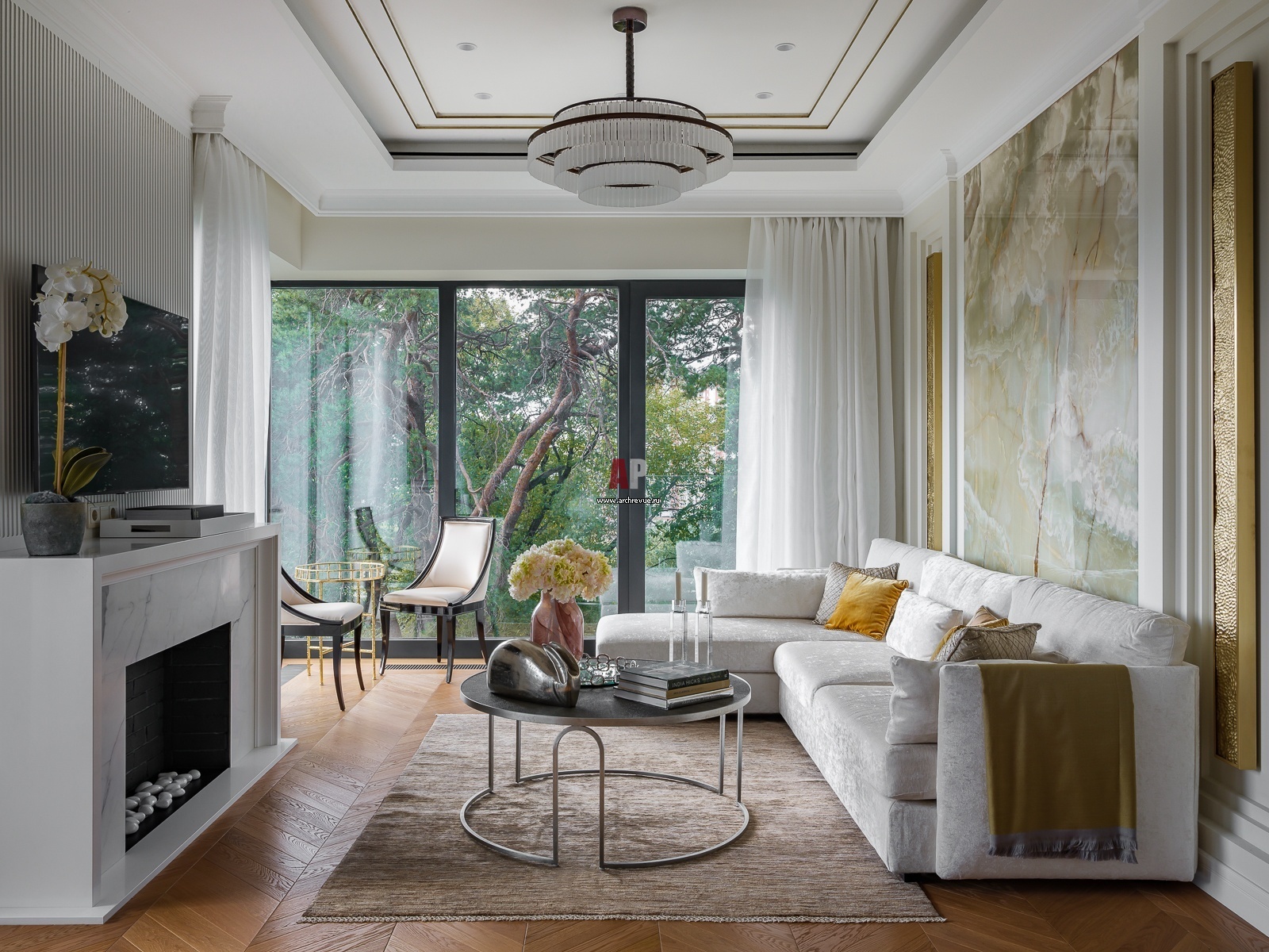 Домината гостиной – панно из оникса (1,80Х2,20 м), обрамленное авторскими светильниками из латуни с имитацией чеканки. Напротив светлого дивана Sevensedie – биокамин, его портал с фактурой мрамора. Центральная люстра, Italamp.
