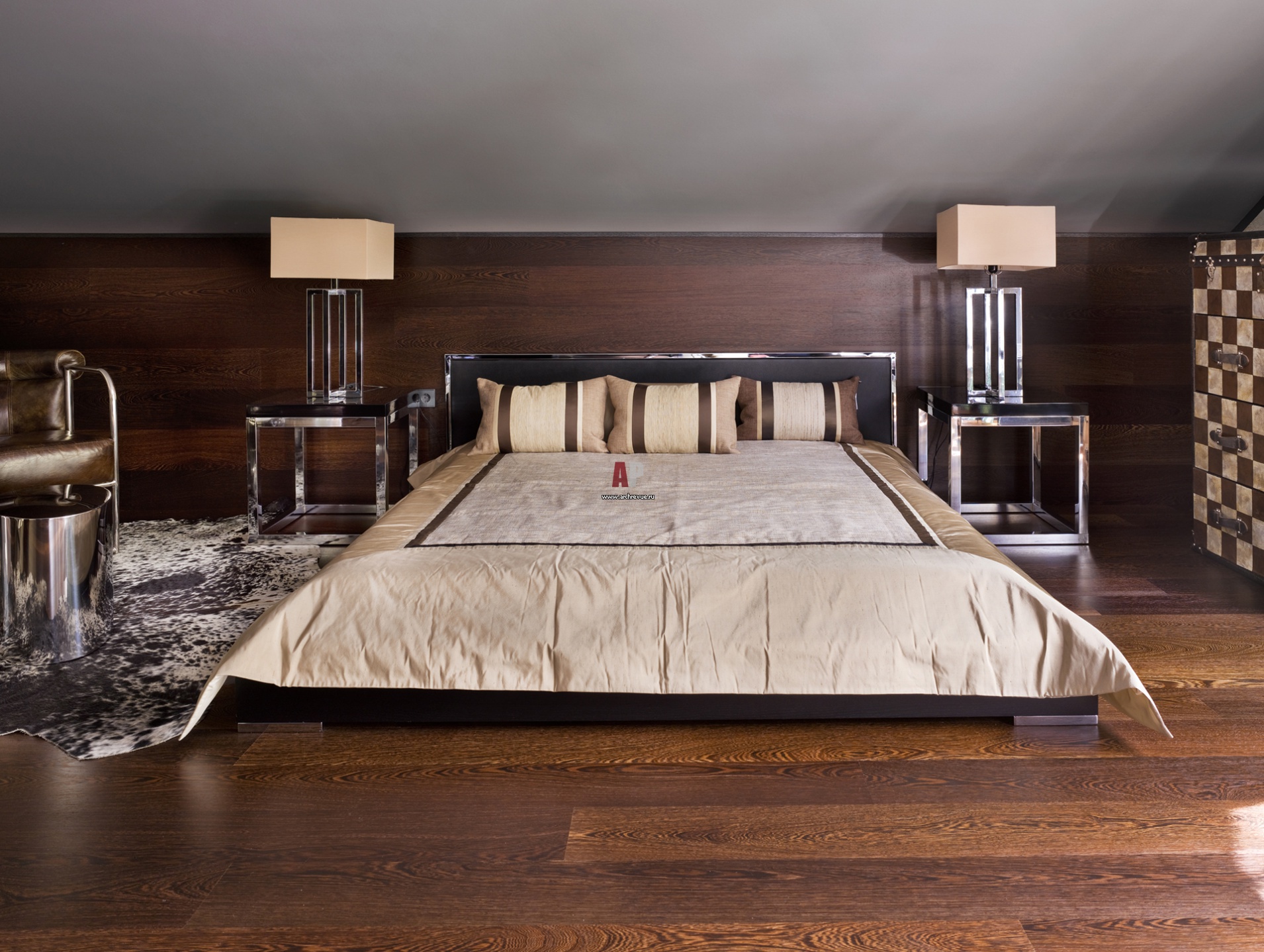 Фото интерьера гостевой спальни с шахматным комодом на втором этаже SPA-комплекса. Стена за изголовьем зашита темным красноватым деревом.