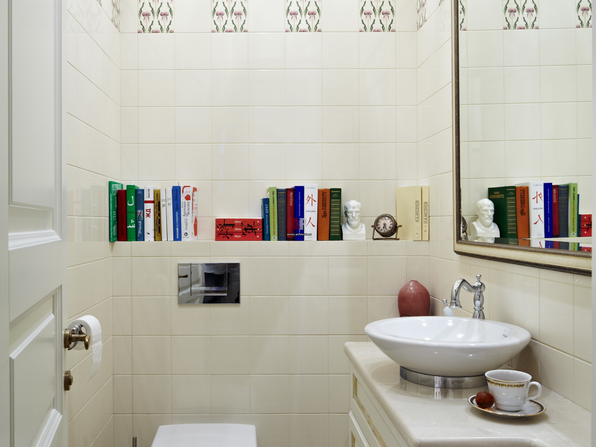 Интерьер гостевого туалета оформлен белой английской керамической плиткой с декоративным карнизом из цветной керамики Original Style, поставщик «Интерьерный салон» (салон «Биг Бен»). Нише сделана полка для книг.