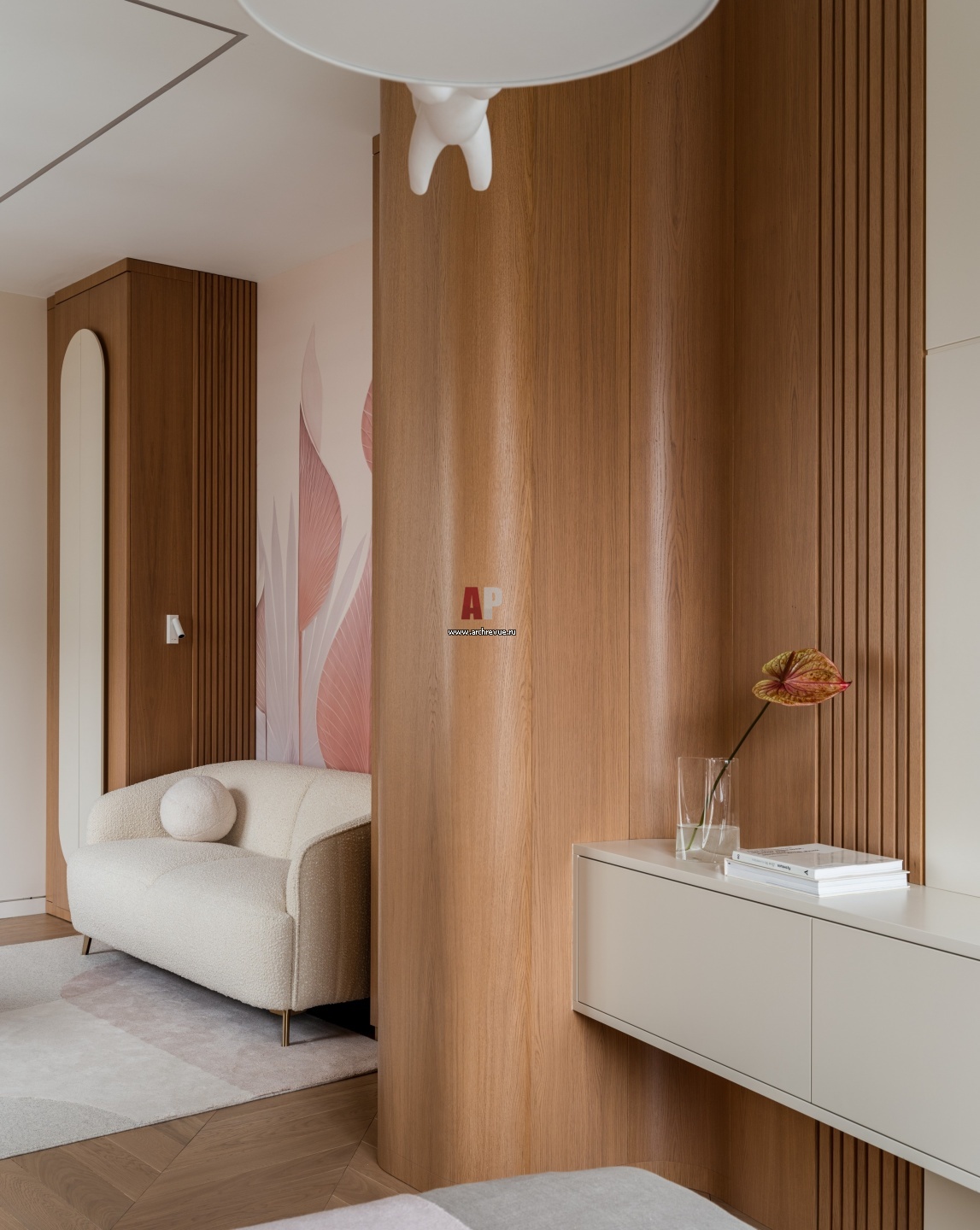 Квартира в стиле софт-минимализм для семьи с двумя детьми. Детская дочери. Зона отдыха за деревянной перегородкой.