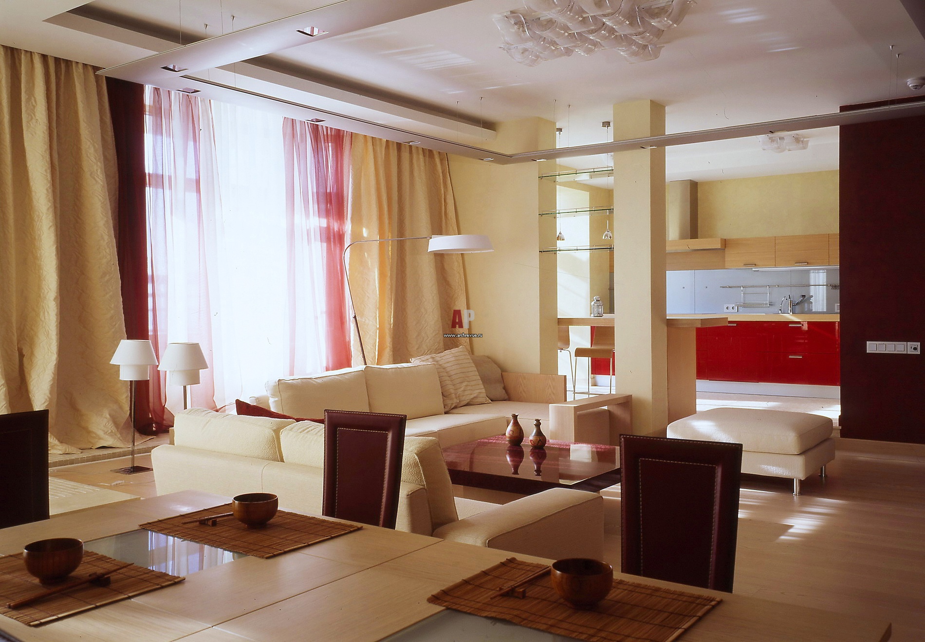 В парадной гостиной первого этажа большие окна в пол декорированы легкими полупрозрачными занавесками. Диваны Vibieffe, журнальный столик, IL Loft. Границы гостевой зоны подчеркивает подвешенная к потолку гигантская металлическая рама – светильник. Кухня Euromobil.