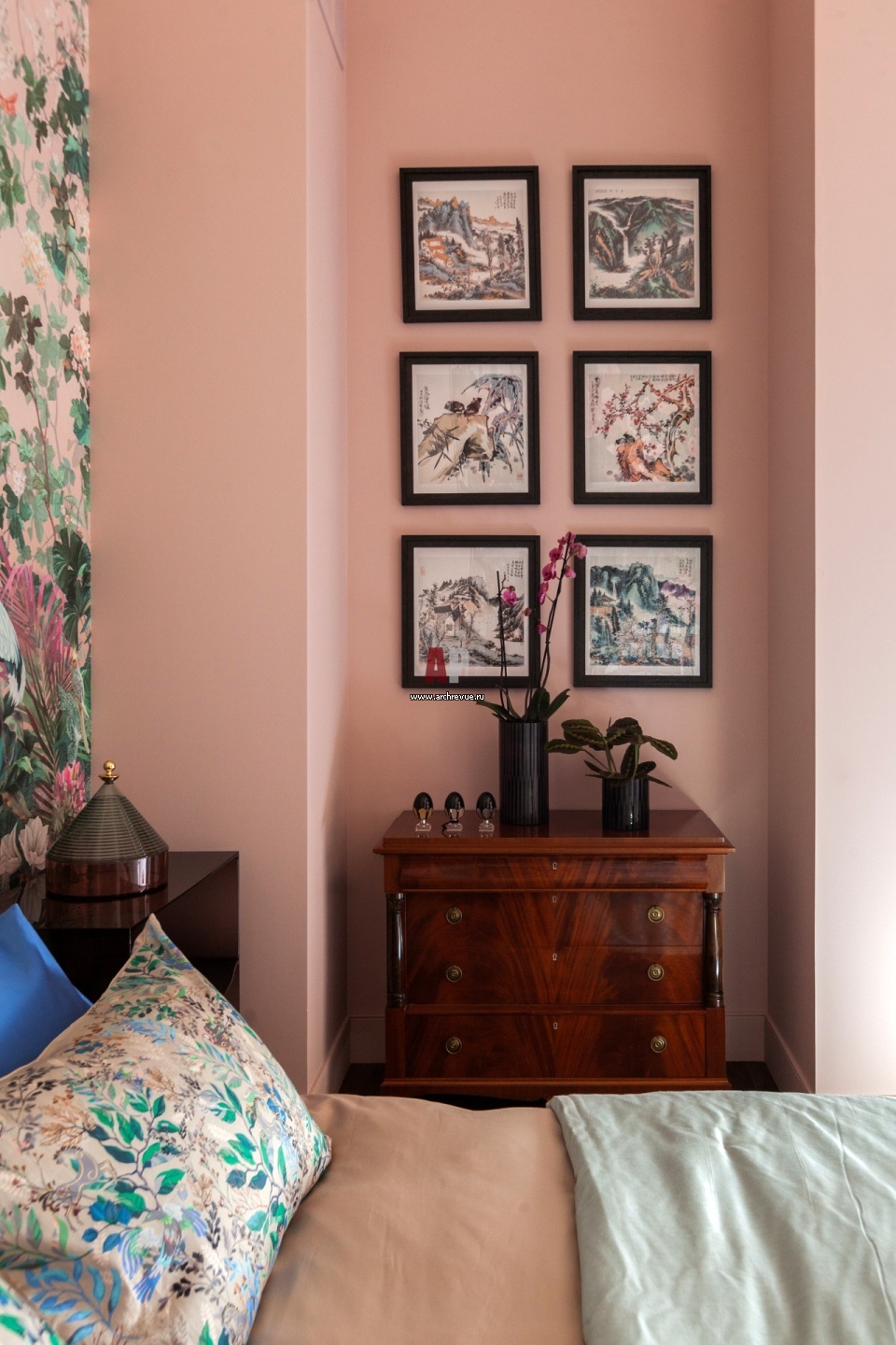 Хозяйская спальня на втором этаже. Если стены первого этажа окрашены в голубой цвет, то второго – в розовый.