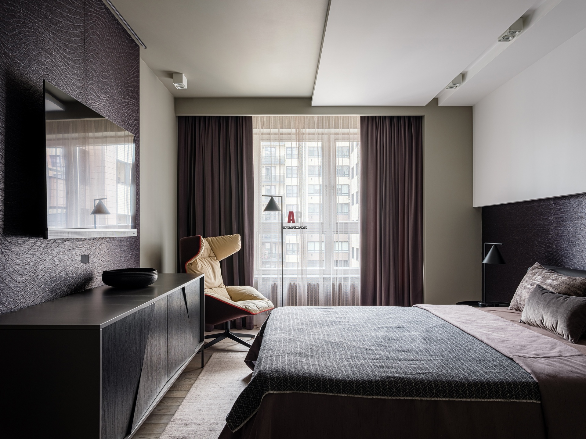 Мужская спальня. Кровать и комод, Alf DaFre. Кресло, Moroso. Прикроватные столики, B&B Italia.
