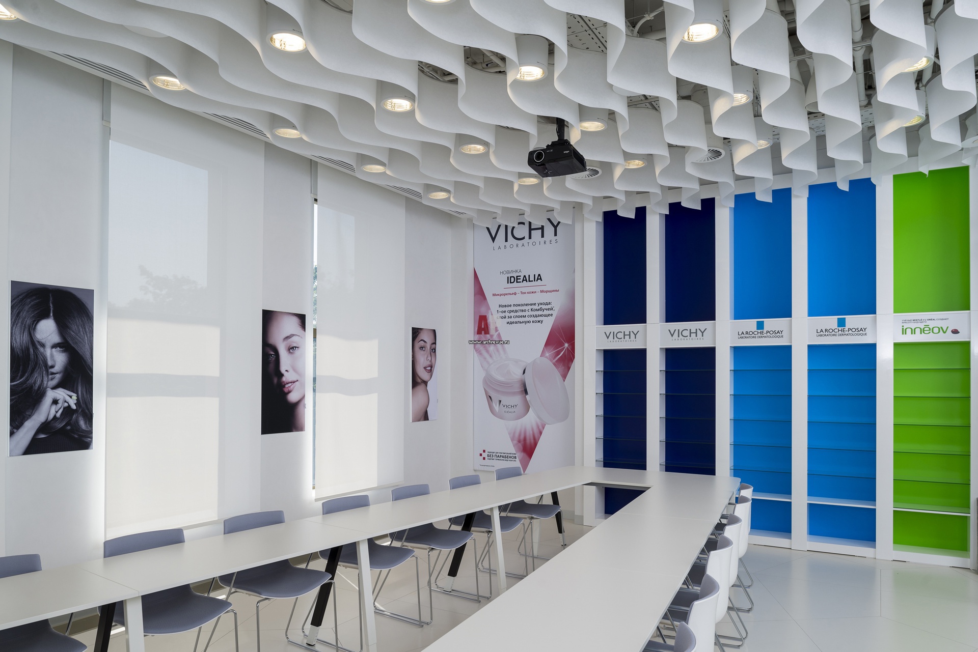 Белая переговорная оформлена цветными плакатами компаний, входящих в концерн L’Oréal. Потолки украшены декоративными волнами из пластика.
