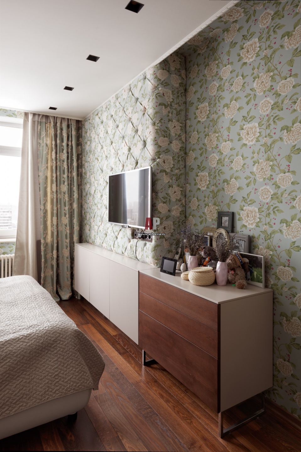 Фото интерьера спальни в сине-голубых тонах. Стены обиты тканью Sanderson, стена за ТВ оформлена объемной стежкой в технике капитоне.