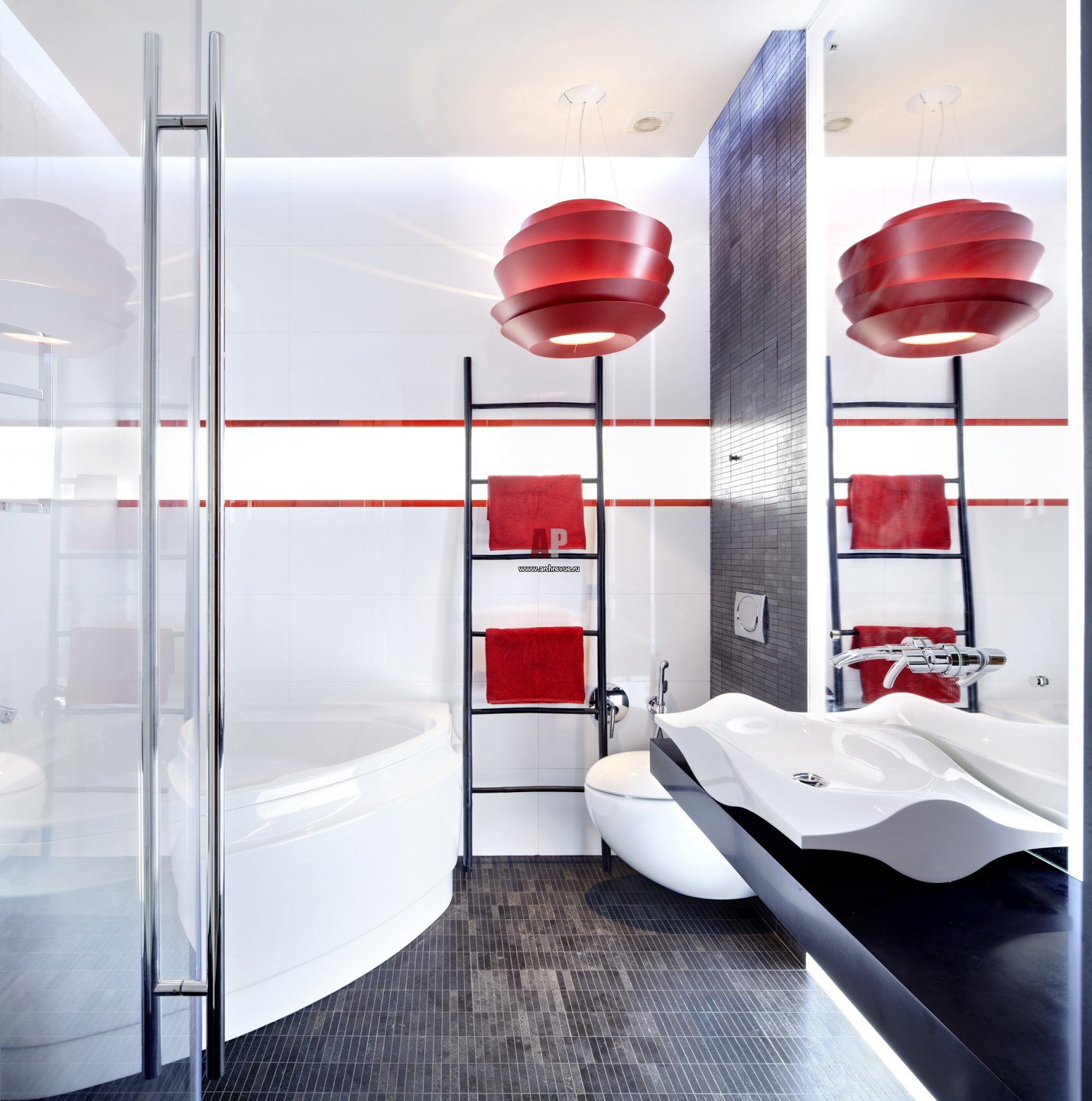 Интерьер хозяйского санузла в черно-белой цветовой гамме с красными акцентами. Угловая ванна, черный полотенцесушитель в виде лестницы. Красный светильник, напоминающий японский фонарь.