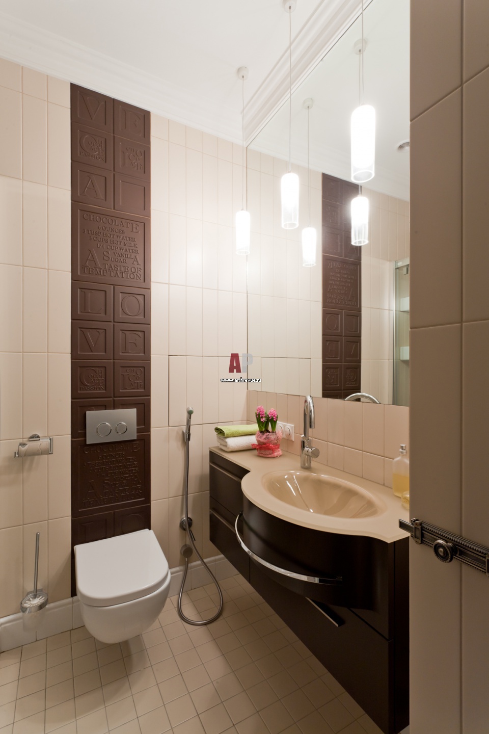 Гостевой санузел решен в нейтральной цветовой гамме. Плитка шоколадного цвета с рельефными буквами латинского алфавита, Steuler Design.