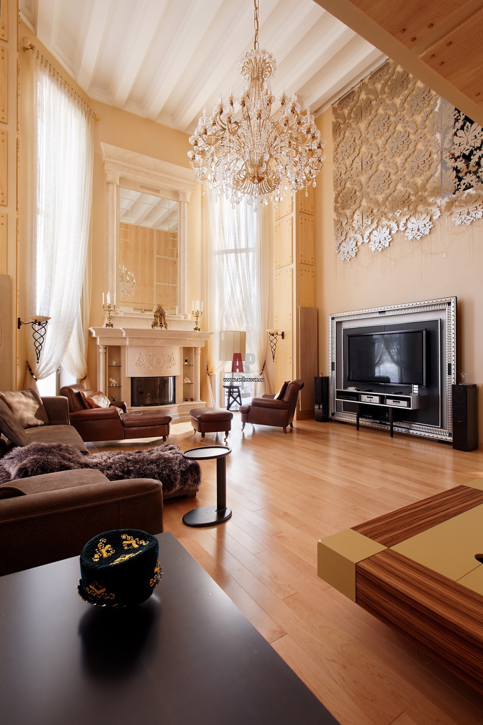 Зона ТВ решена артистично. Оконный проем кабинета второго этажа задекорирован металлической ширмой Rugiano с цветочным орнаментом.