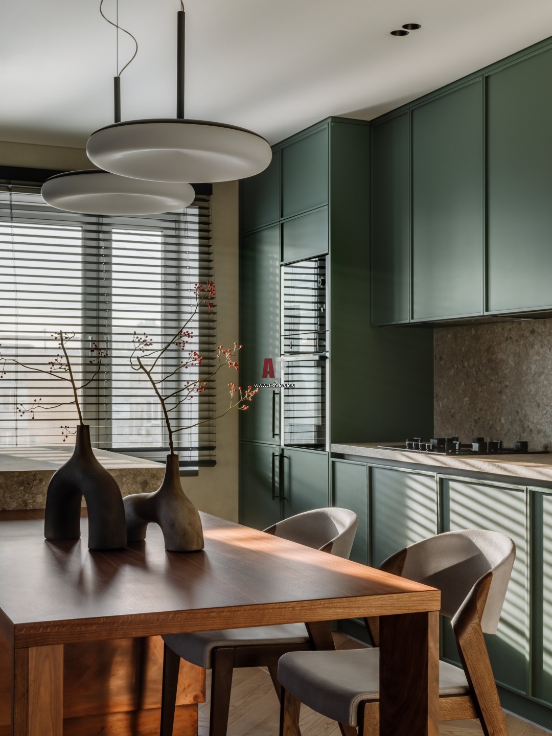 Кухня-столовая. Окна декорированы деревянными жалюзи, которые создают камерность и дают красивую игру светотени на поверхностях.