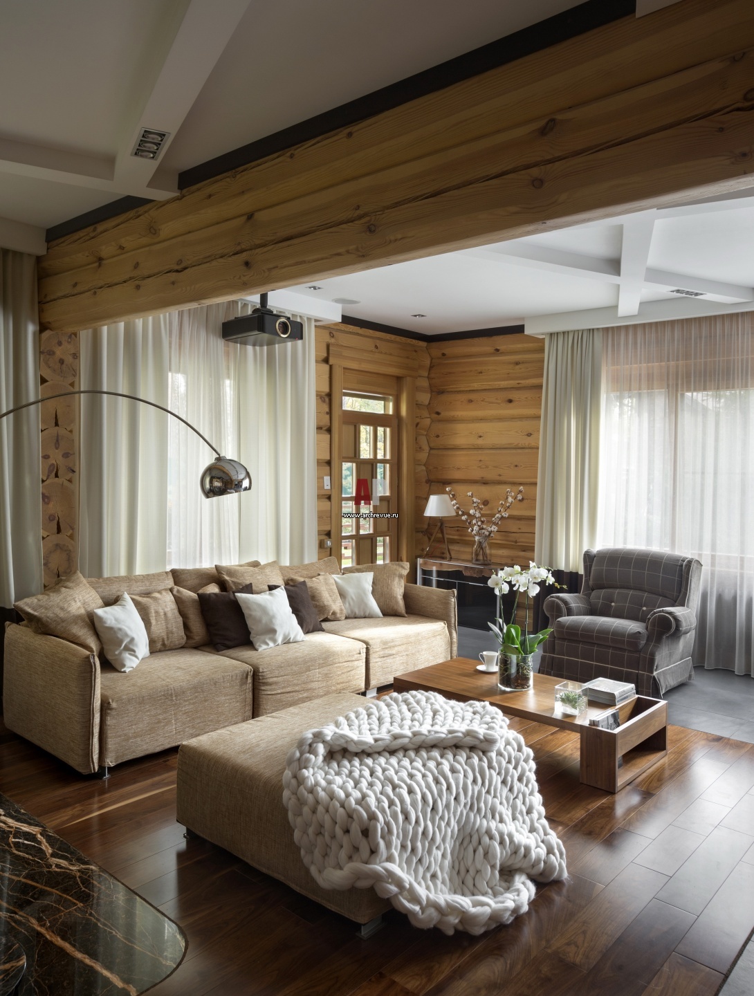 Центральная потолочная балка, отделяющая кухню от гостиной, служит местом монтажа экрана домашнего кинотеатра. Пластика белого потолка олицетворяет ветви деревьев.