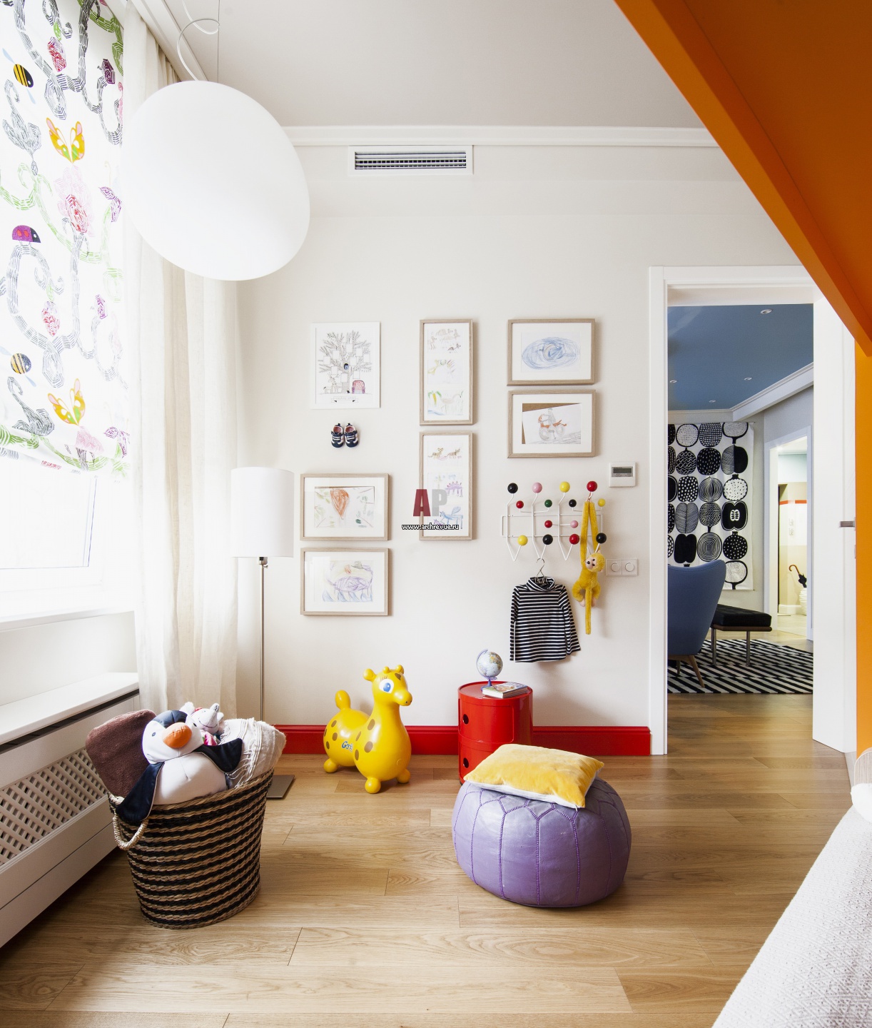 Интерьер детской комнаты девочек. Кровати и встроенный шкаф сделаны на заказ. Тумба, Kartell. Потолочные и подвесной светильники, Fabbian. Шторы сшиты из льна.