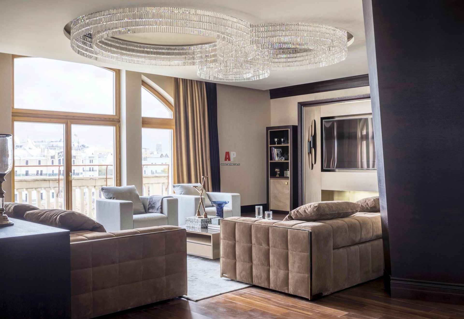 Ядро квартиры – опейн спейс площадью 100 кв. м. Светильник, Preciosa Lighting. Диван, Visionnaire. Журнальные столики, кресла, Fendi.