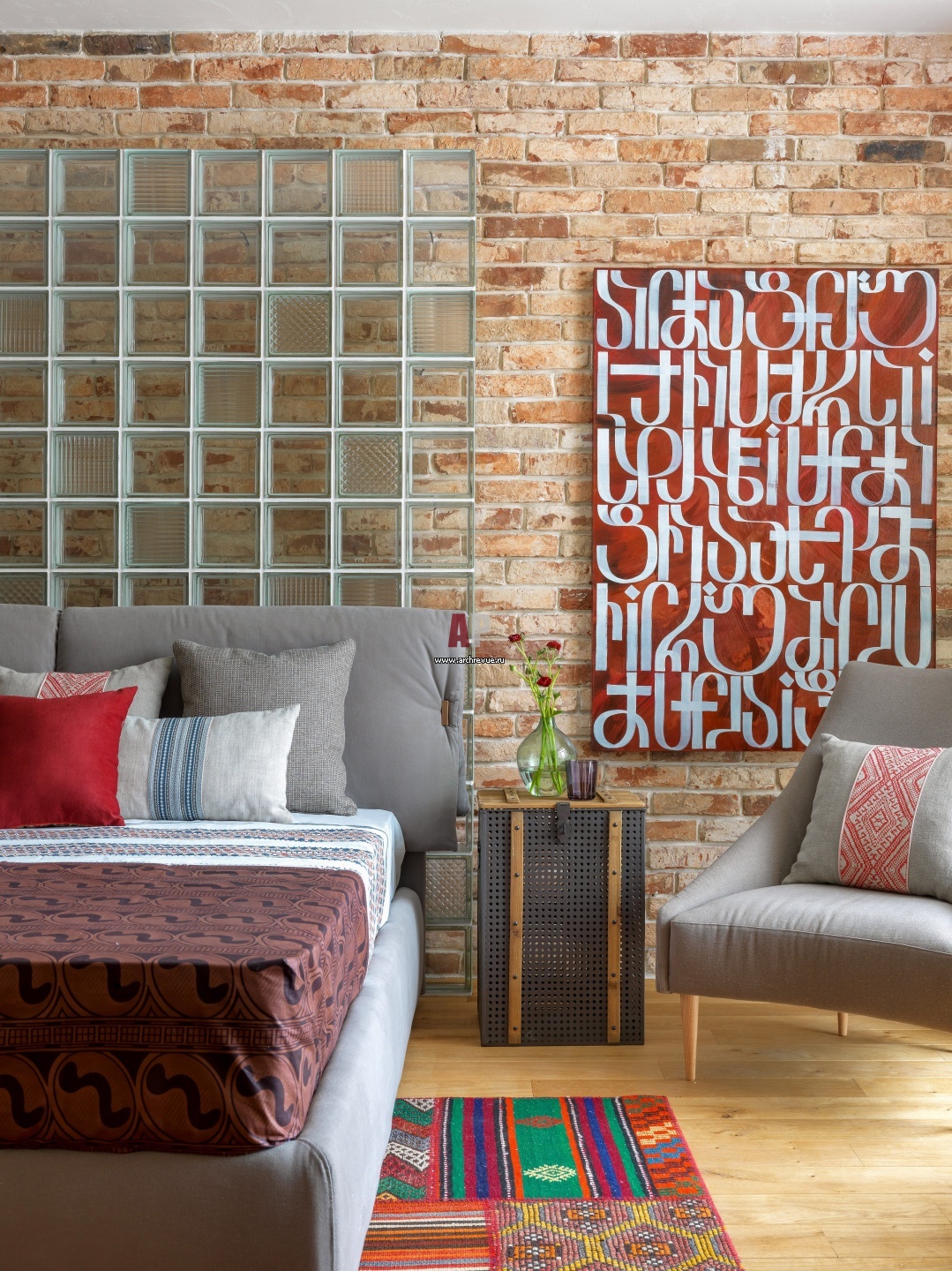 Дом с элементами стиля лофт, этники и винтажа. Панно из стеклопрофилита отсылает к промышленным интерьерам начала XX века.