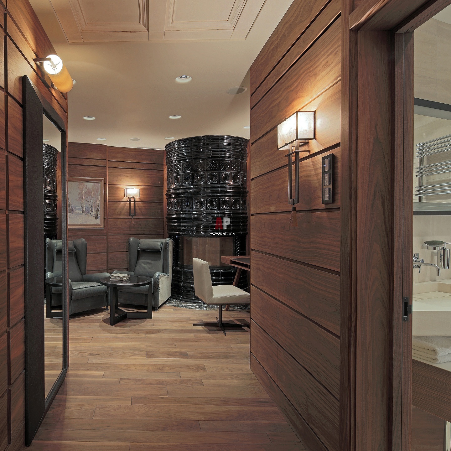 Лаунж перед главной спальней. Стены зашиты панелями из массивна ореха, они имитируют брус.