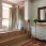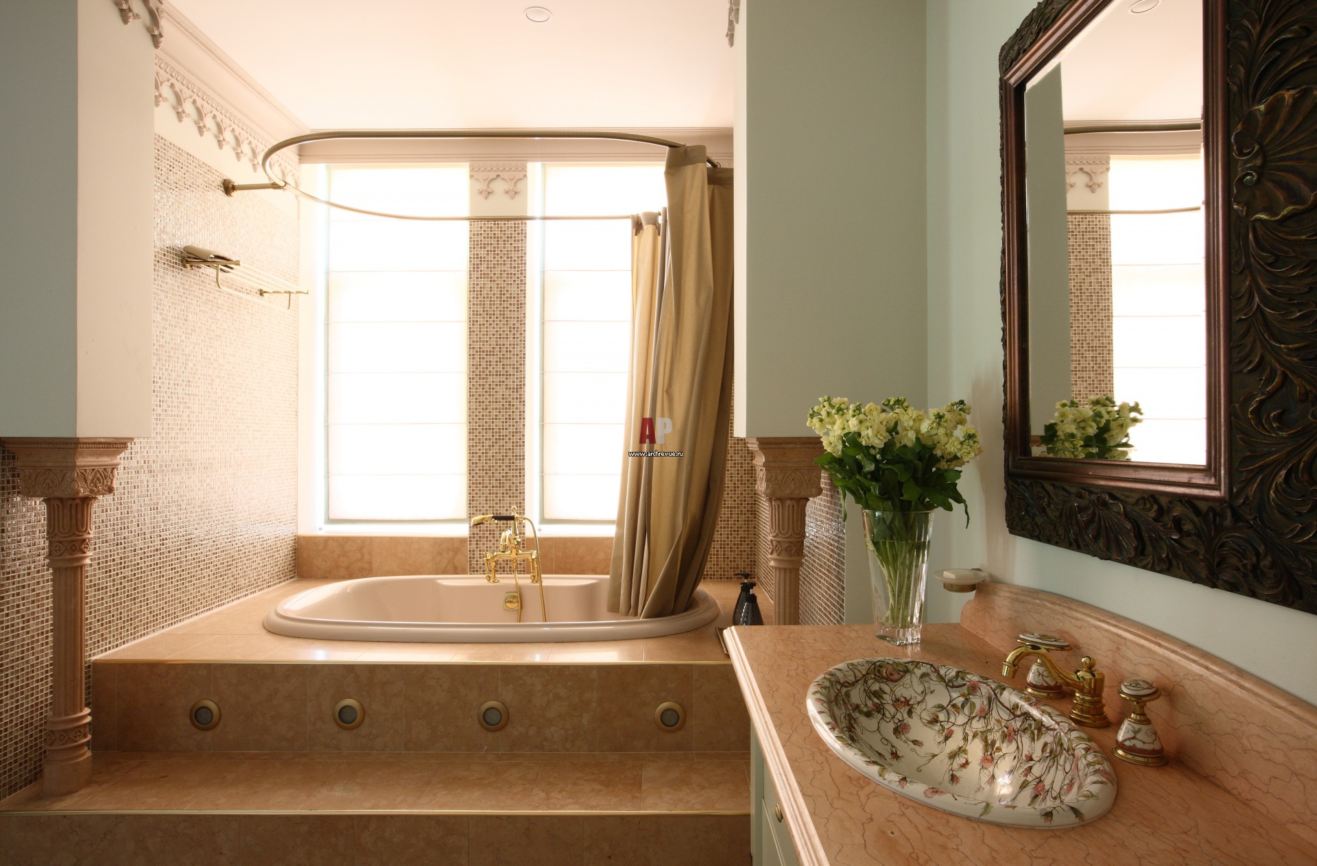 Ванна расположена у окна и встроена в подиум. Стены вокруг нее облицованы стеклянной плиткой, смесь цветов подбиралась индивидуально. Раковина украшена ручной росписью. Сантехника, Kohler.
