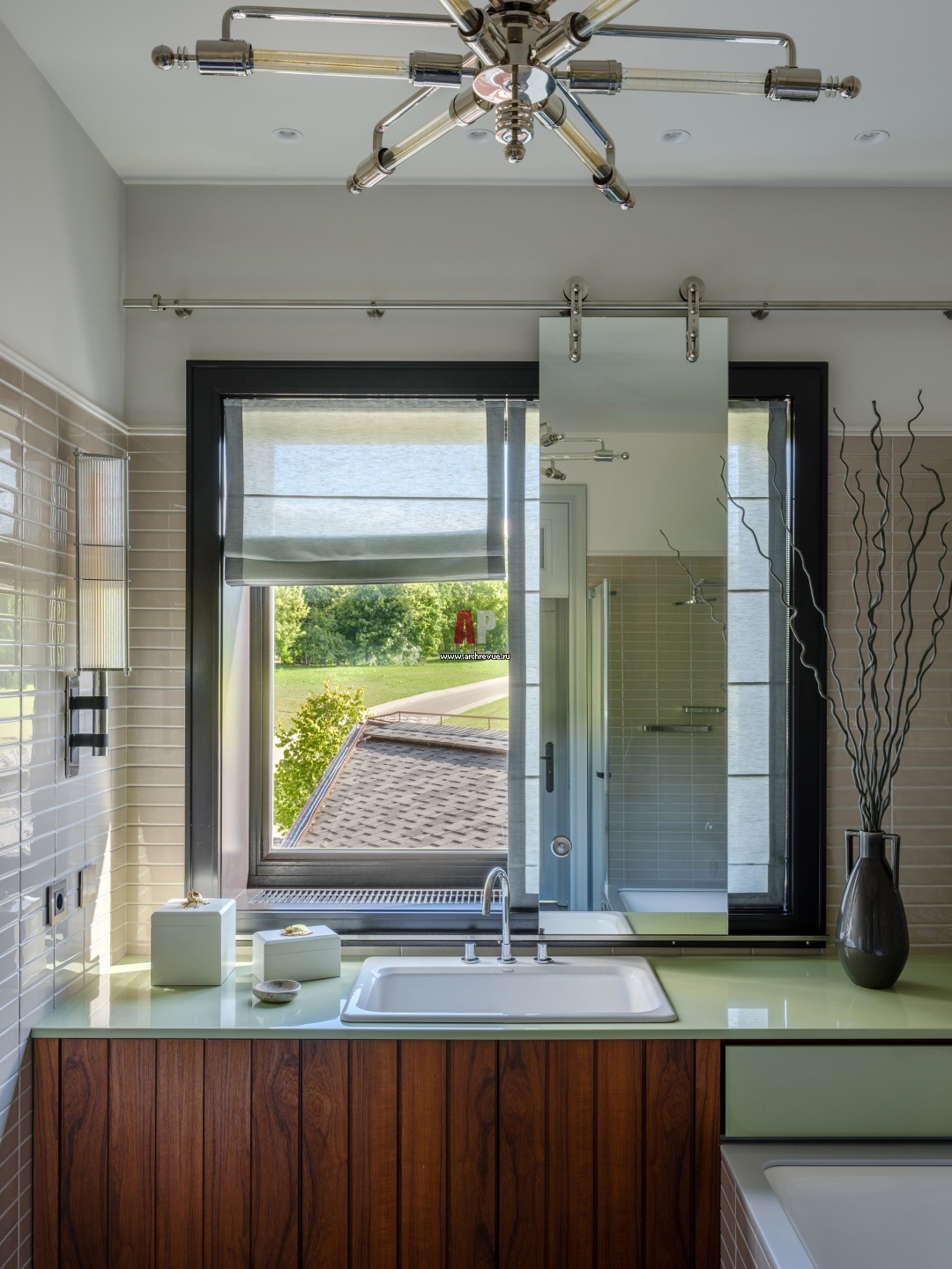 Интерьер детского санузла с панорамным окном. Вдоль окна по металлической штанге перемещается зеркало. Оно создано пои эскизам авторов проекта. Светильник в стиле Баухаус, Zeitlos Berlin, винтаж, 1930-е годы.