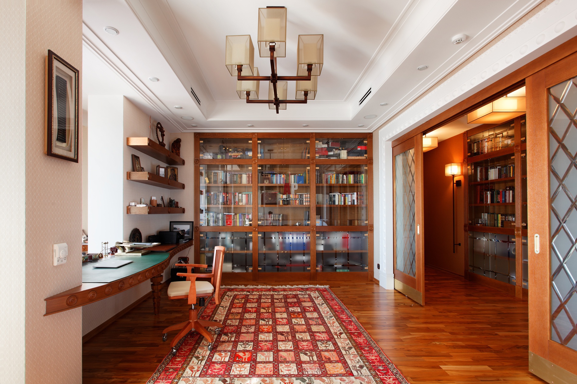 Помимо авторского стола в кабинете выделяется зона библиотеки. Шкафы и стеллажи выполнены на заказ по эскизам архитекторов.