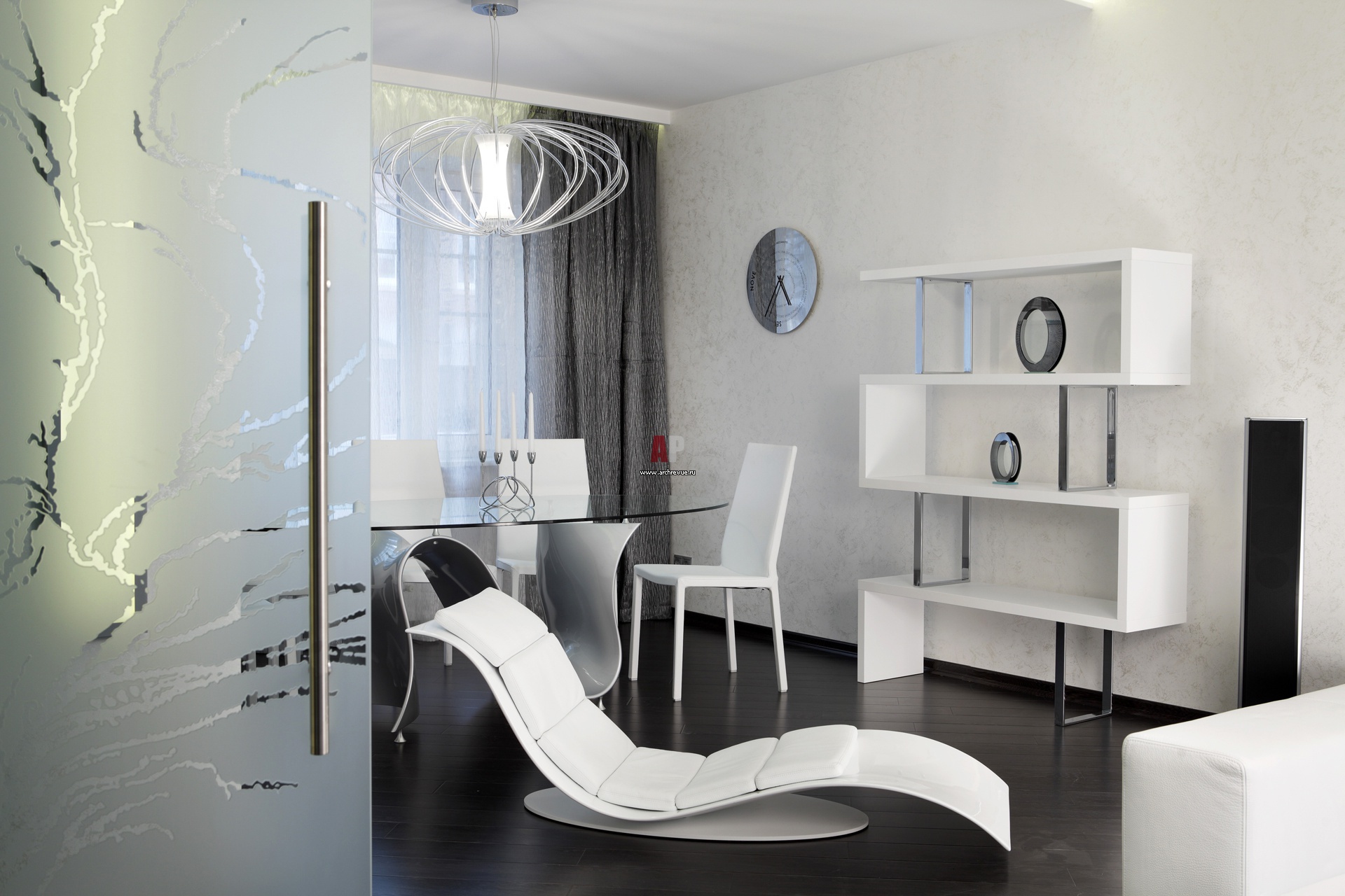 Интерьер современной гостиной. Кресло из белой кожи, кресло De Sede. Белый глянцевый стеллаж, Tonin Casa.