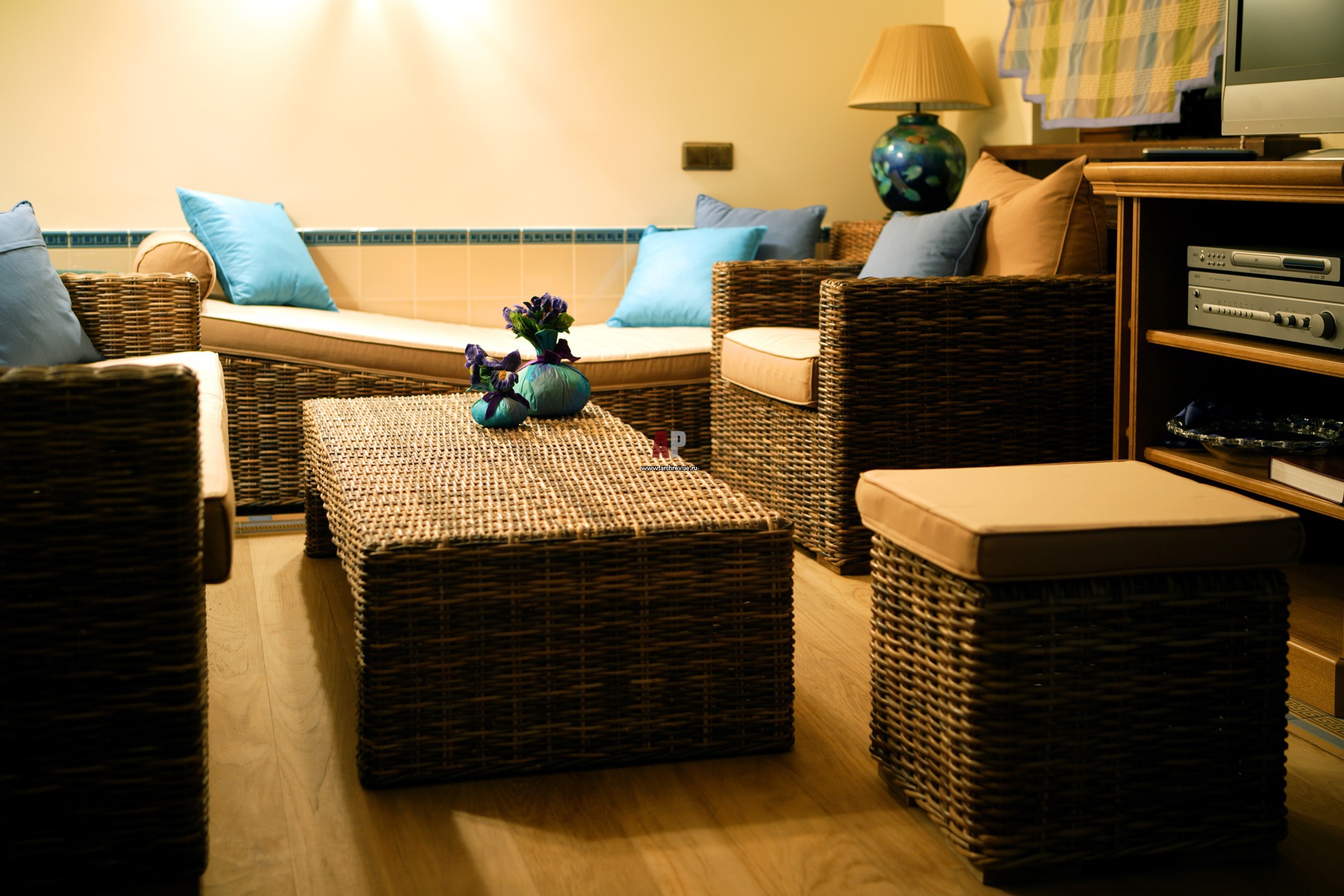 Фрагмент интерьера зоны отдыха. Релаксу способствует плетеная мебель из ротанга.