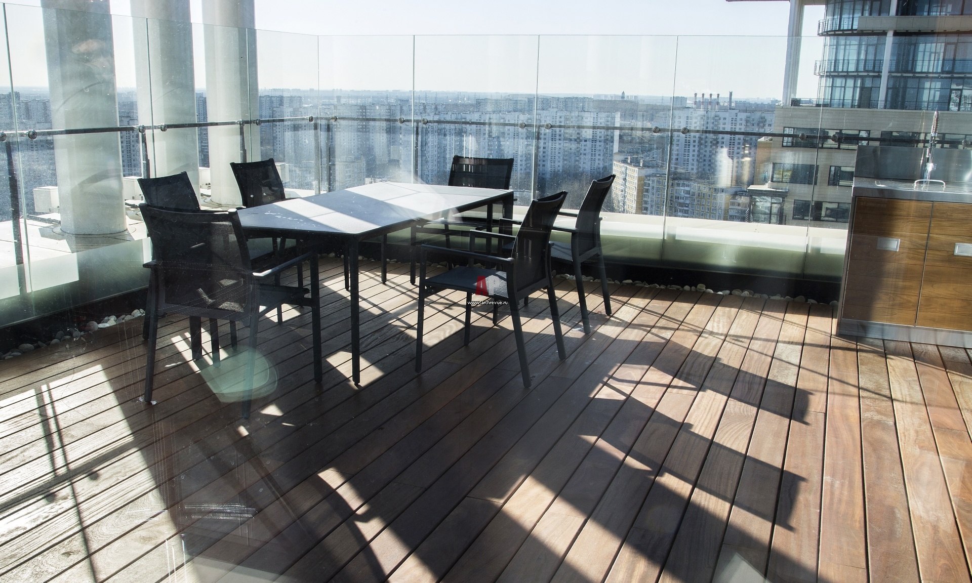 Открытая терраса на крыше. По периметру установлено ограждение высотой 1,80 м из ветрозащитного стекла. На полу – доска из тика, устойчивого к влаге и перепадам температур.