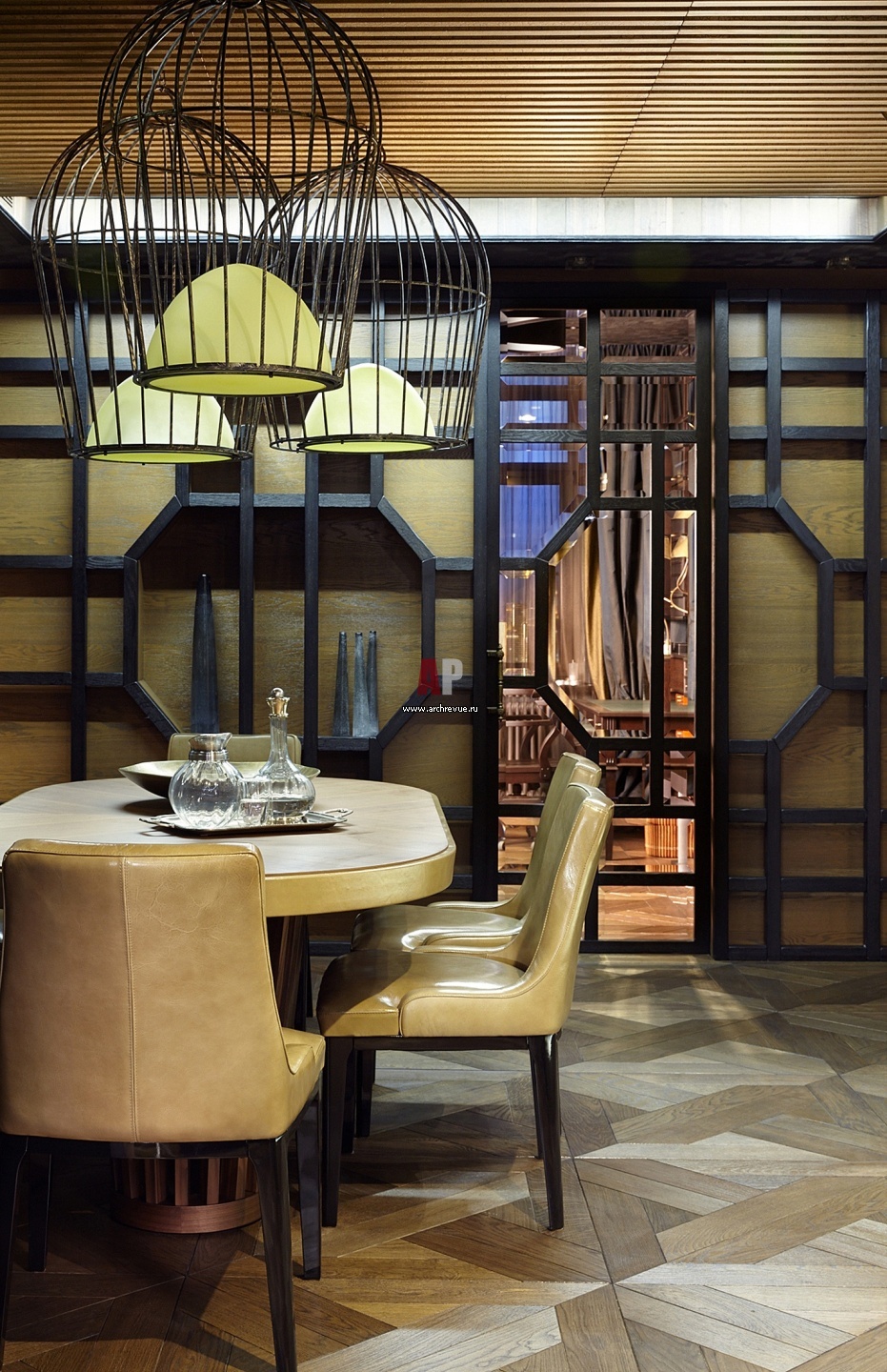 Самое темное помещение в квартире – парадная столовая. Недостаток солнечного света в ней компенсируют встроенные подсветки. Обеденный стол и стулья, Ulivi Salotti. Лампы-клетки сделаны на заказ.