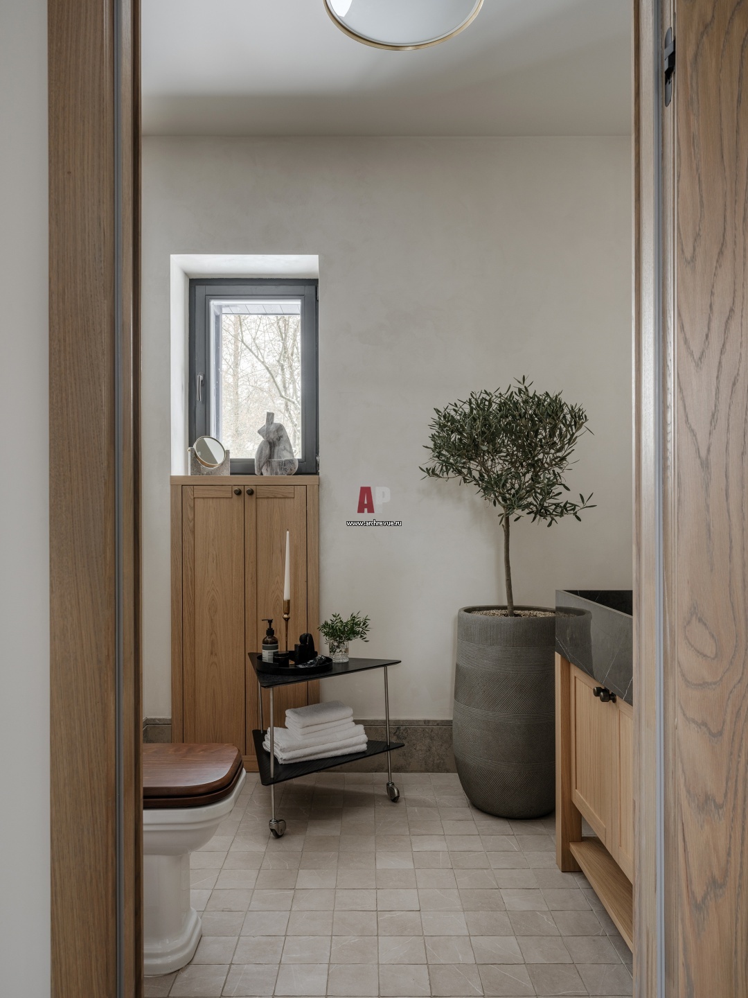 Гостевой санузел на первом этаже. На полу – плитка, Wow, коллекция Gea. Ее дизайн отсылает к каменным полам на старинных средиземноморских виллах. Этот образ поддерживает высокий плинтус из травертина.
