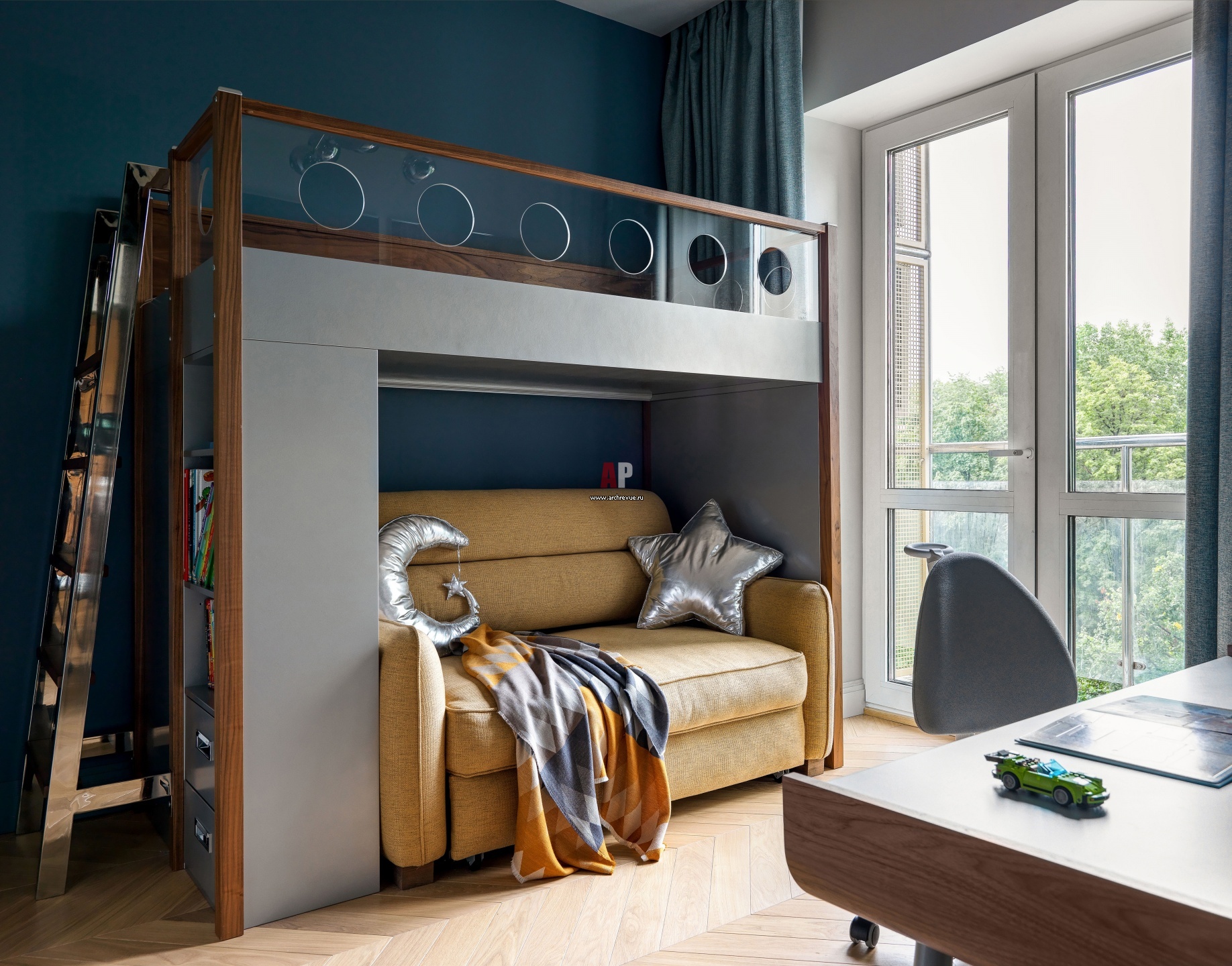 Основной темой детской комнаты стал космос. Не случайно сами дизайнеры ее называют My little cosmos. Двухъярусная кровать из МДФ под эмалью с ограждением из оргстекла и металлической лестницей сделана на заказ. Как и письменный стол, и раскладной диван. Люстра «Спутник» с круглыми металлическими плафонами, винтаж.