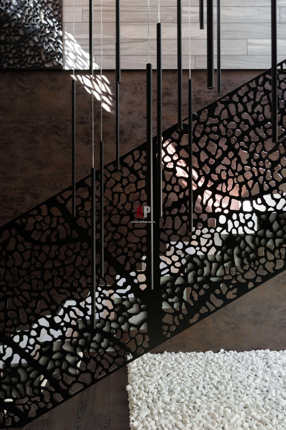 Ажурный рисунок металлического ограждения лестницы имитирует листву деревьев и дает красивы блики, вызывающие ассоциации с солнечным днем в лесу.