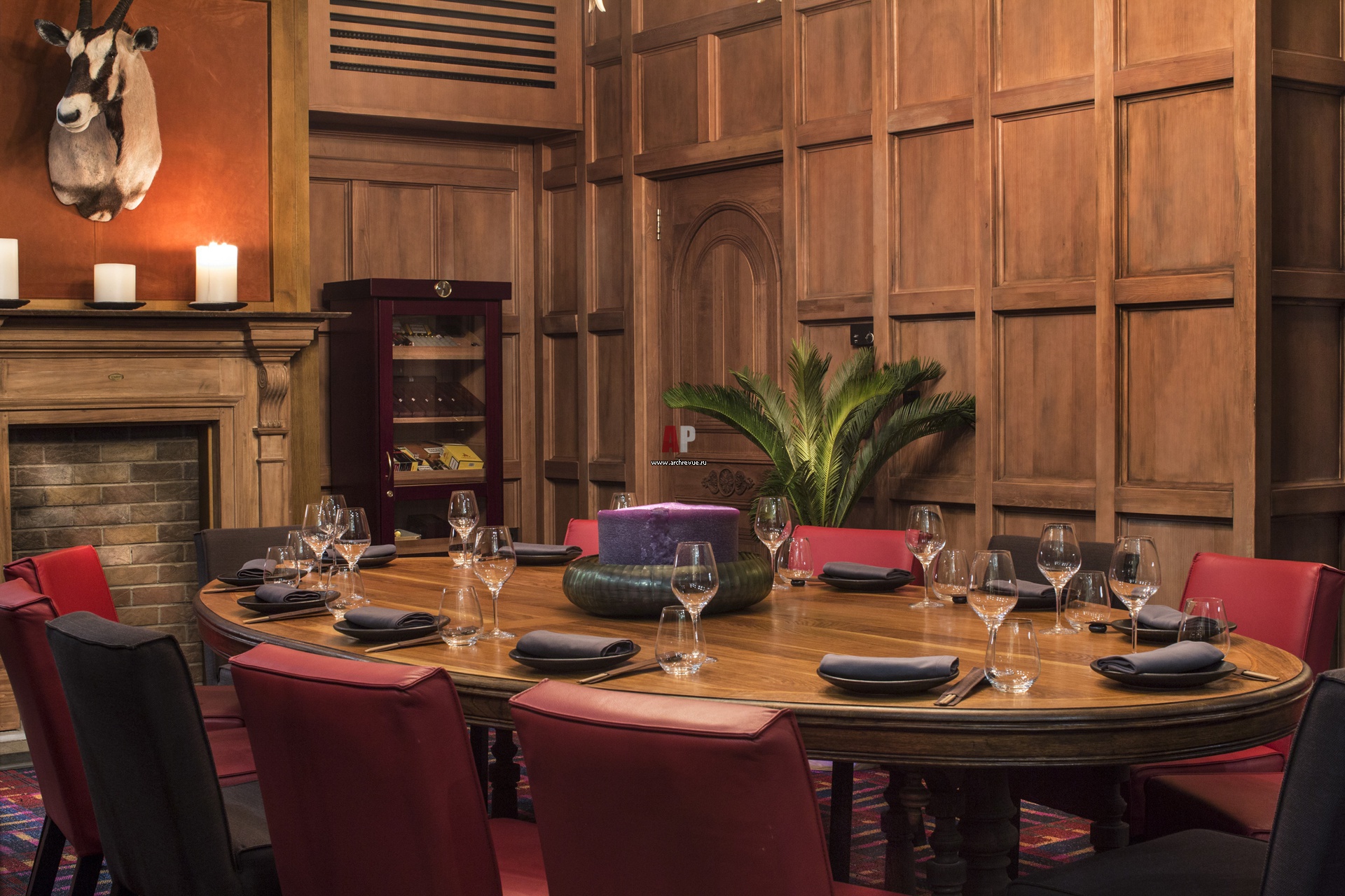 Фото интерьера сигарной комнаты в традиционном европейском стиле с деревянными настенными панелями, камином и уютными тканными коврами.