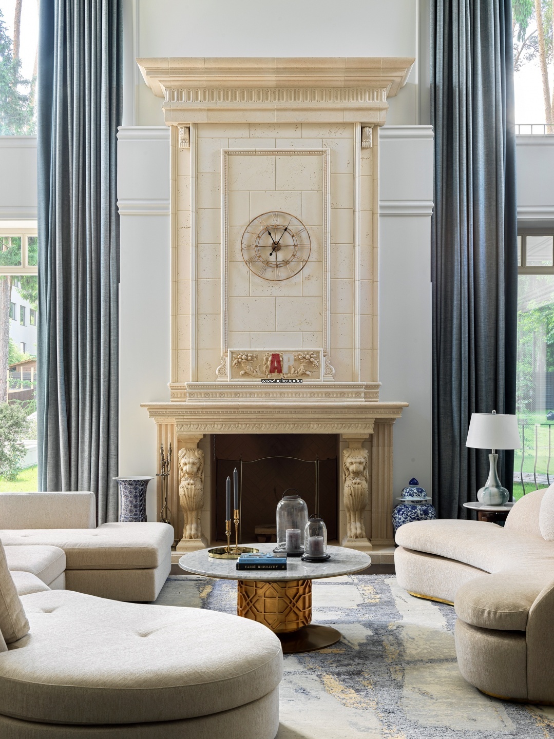 Дизайнеры установили электропривод штор в гостиной. Сами портьеры сшиты из серо-голубой ткани. Светлая голубая гамма оживляет и освежает классический интерьер.