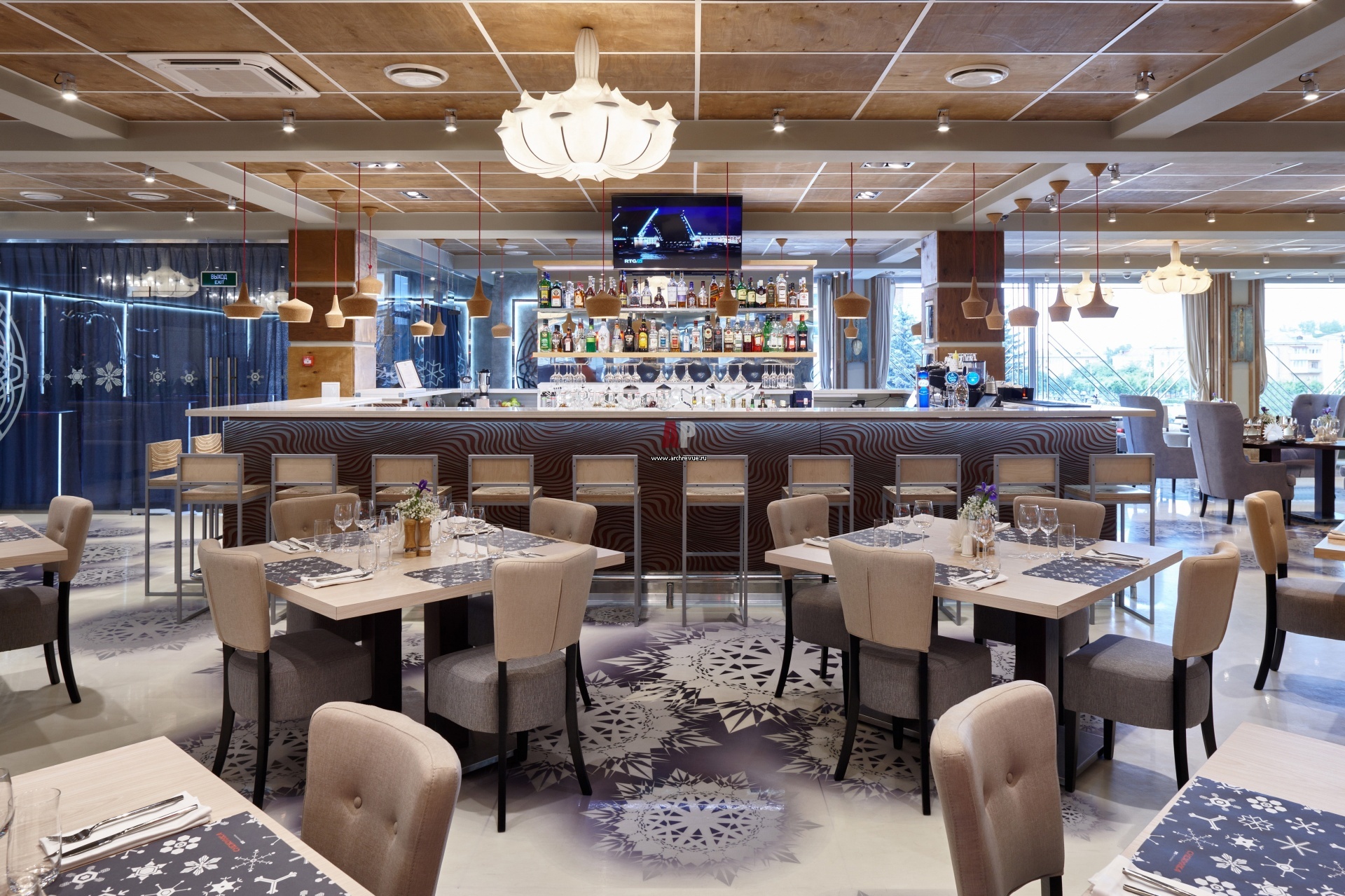 Пространство основного зала сгруппировано вокруг барной стойки. С белым полом контрастирует потолок из огнеупорной авиационной фанеры с матовым покрытием. Деревянные потолочные панели смонтированы по принципу подвесных офисных потолков, что позволяет сохранять мобильность конструкции для дальнейшего обслуживания систем вентиляции и задает ритм членения потолка большого помещения.