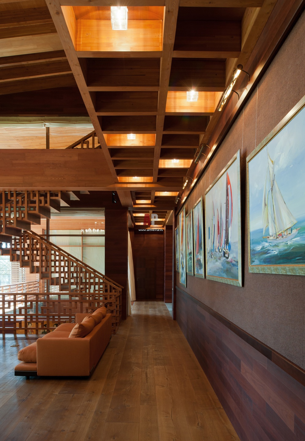 Вид со стороны гостиной на лестничный холл и вход. Потолок под балконом имеет ячеистую форму, в ячейки в шахматном порядке встроены светильники.