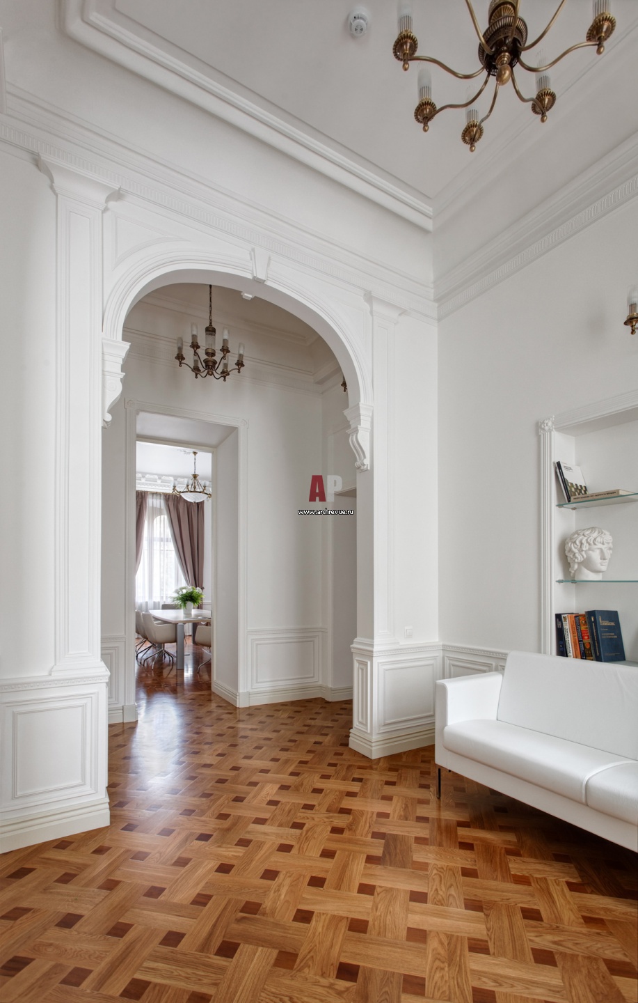 Через коридор приемная сообщается с кабинетами и залами для переговоров. В стене приемной осталась каминная ниша, которую было решено оформить лепными молдингами по периметру, в центре - полки из стекла - «триплекс» для книг.
