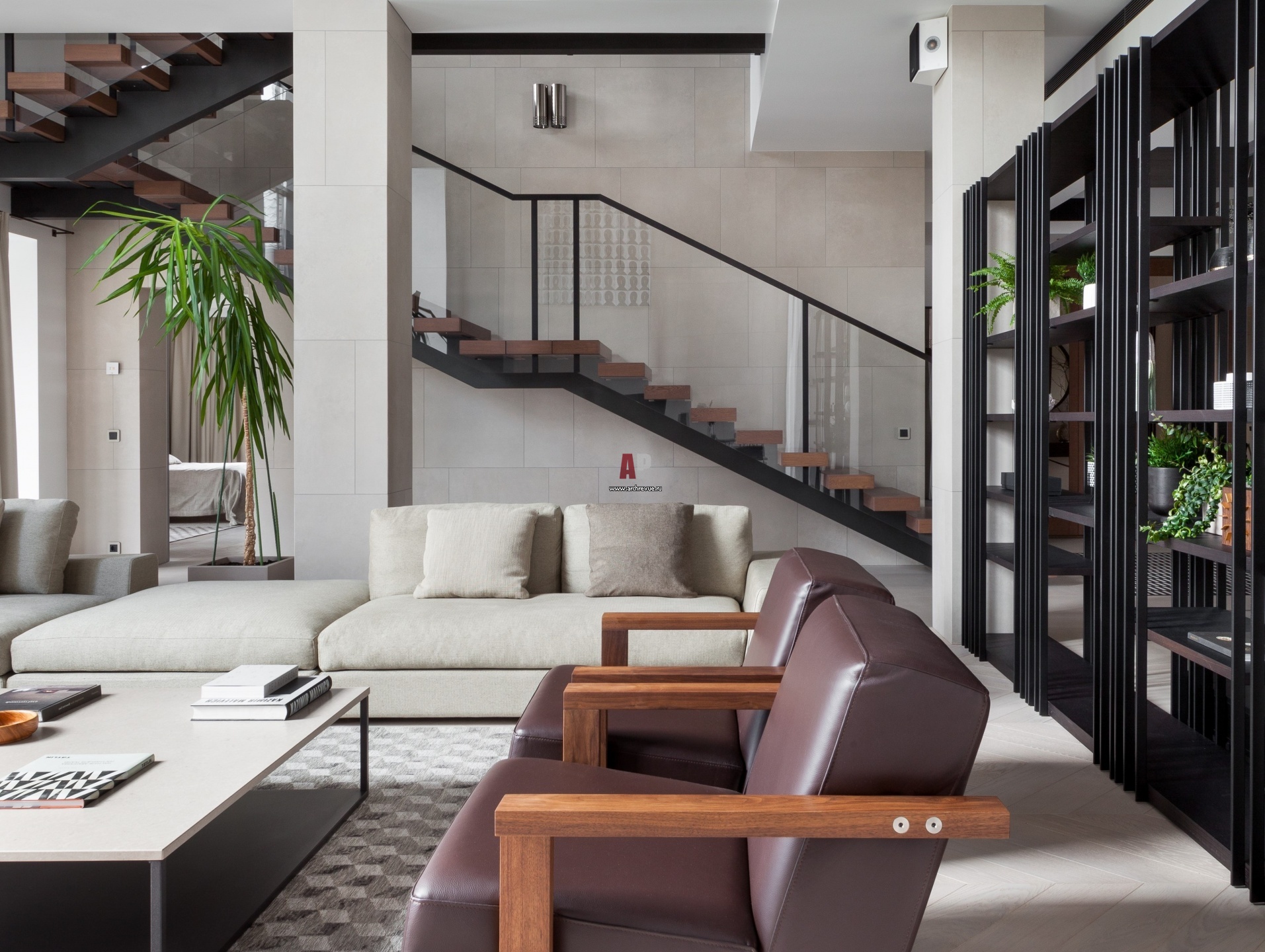 Двухэтажный дом под Минском в эстетике минимализма. Диванная группа и журнальный столик, Arketipo. Кресла, Riva 1920.