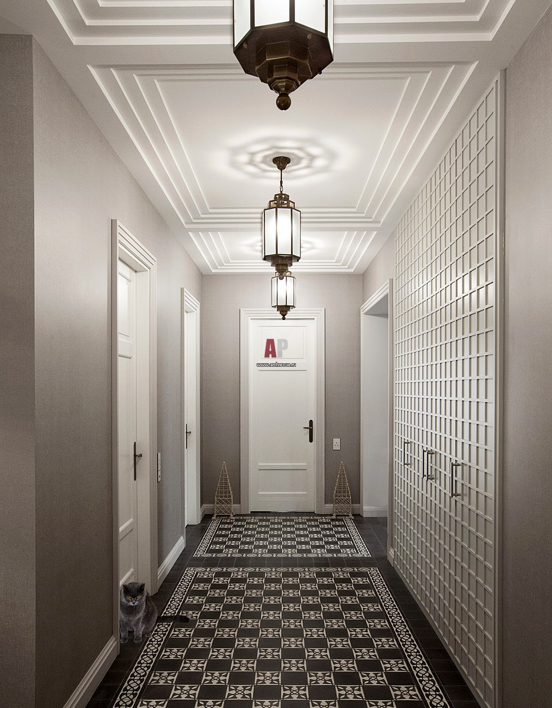 Жемчужная прихожая. Дверцы встроенного шкафа - копия с оригинала конца XIX века. Наличники и плинтус выполнены по французской традиции из гипса.