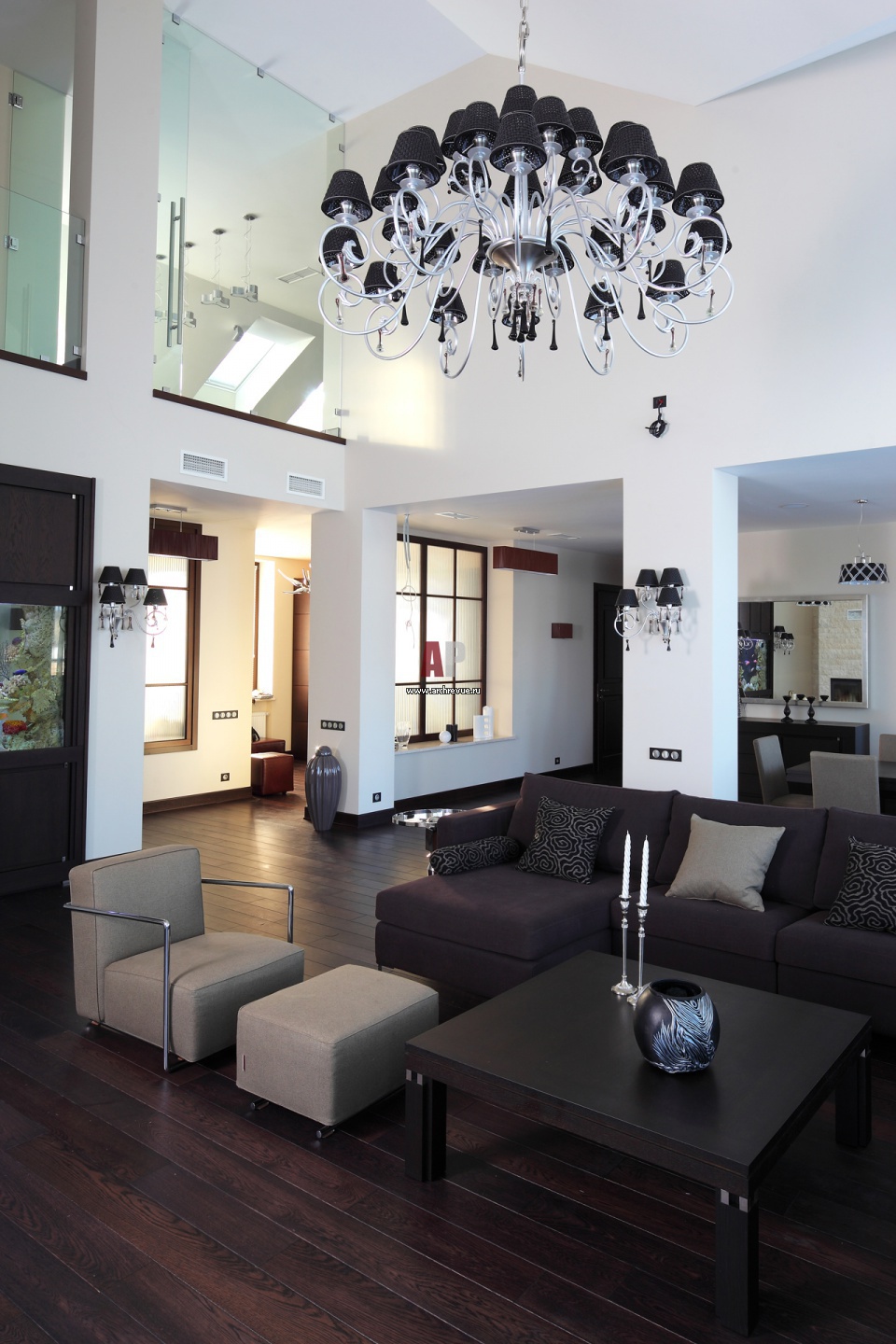 Интерьер двухсветной гостиной в стиле минимализм. Ограждение балкона второго этажа выполнено из прозрачного стекла с хромированными креплениями, отчего интерьер выглядит легким, светлым и воздушным. Центральная люстра в неоклассическом стиле с серебром и черными абажурами.