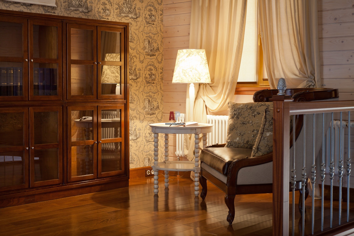 Фото интерьера библиотеки в зоне отдыха второго этажа. Книжный шкаф с закрытыми полками из красноватого ореха с витражами.
