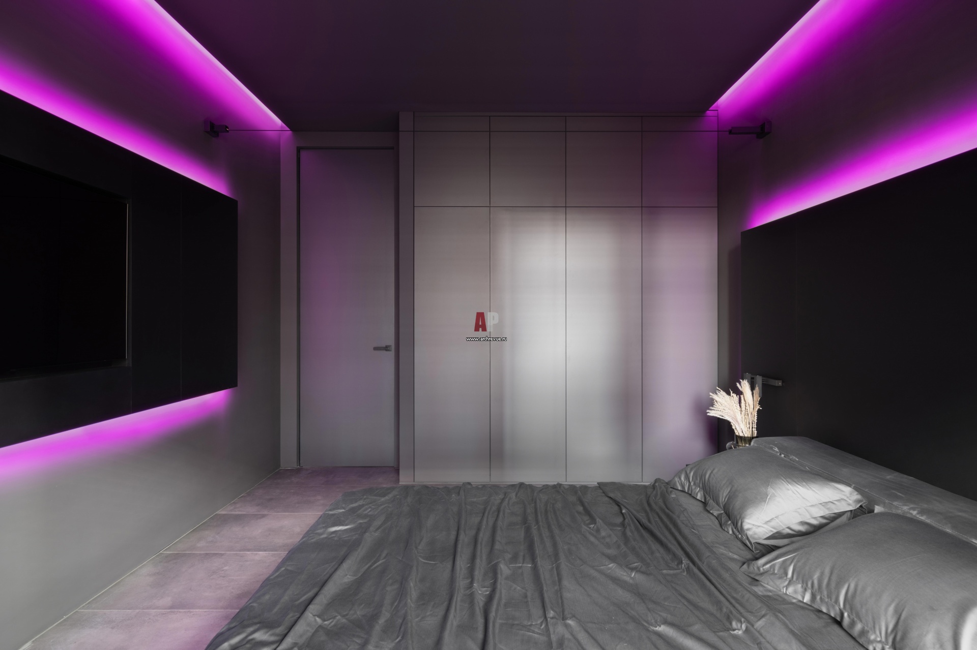 Мужская квартира с черным монохромным интерьером и цветной подсветкой. Спальня.