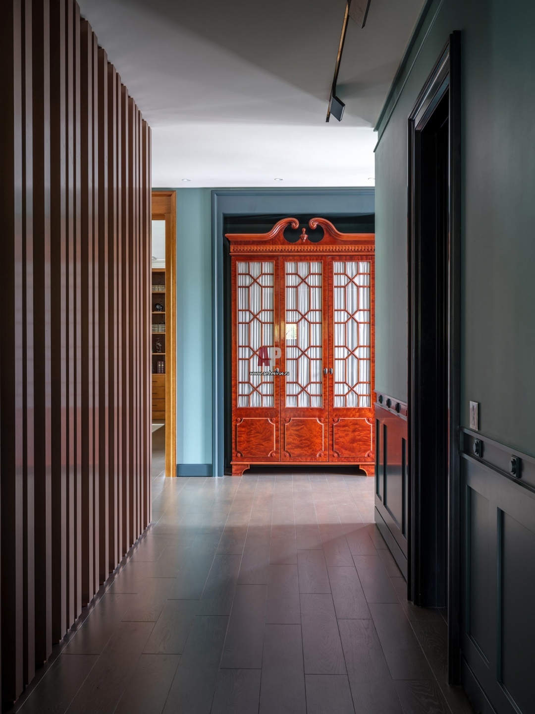 Дом для большой семьи с детским этажом. Стены в холле первого этажа выкрашены в бирюзовый цвет. Шкаф из красного дерева сделан на заказ.