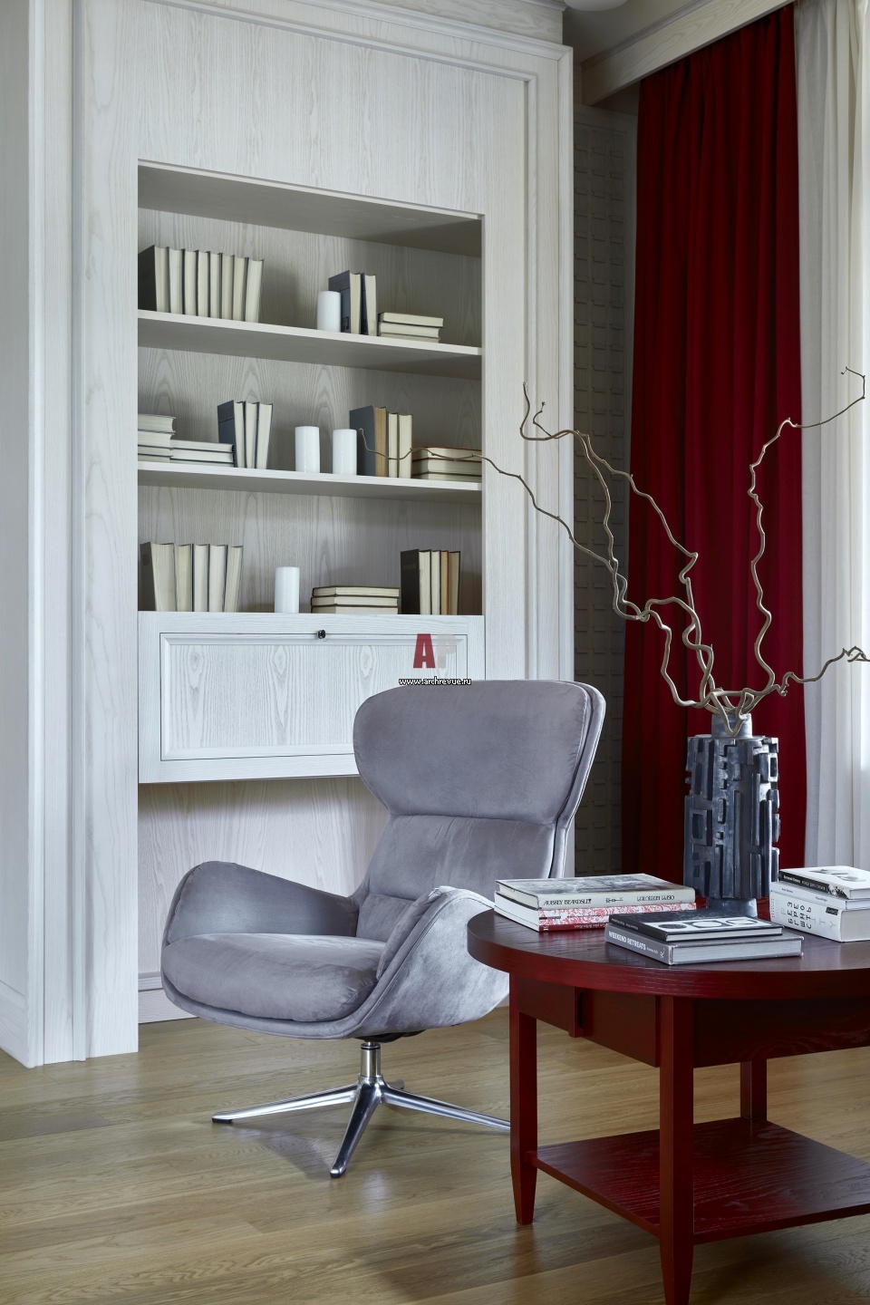Встроенный шкаф-библиотека в гостиной сделан из массива ясеня на заказ по эскизам дизайнера. Кресло, BoConcept.