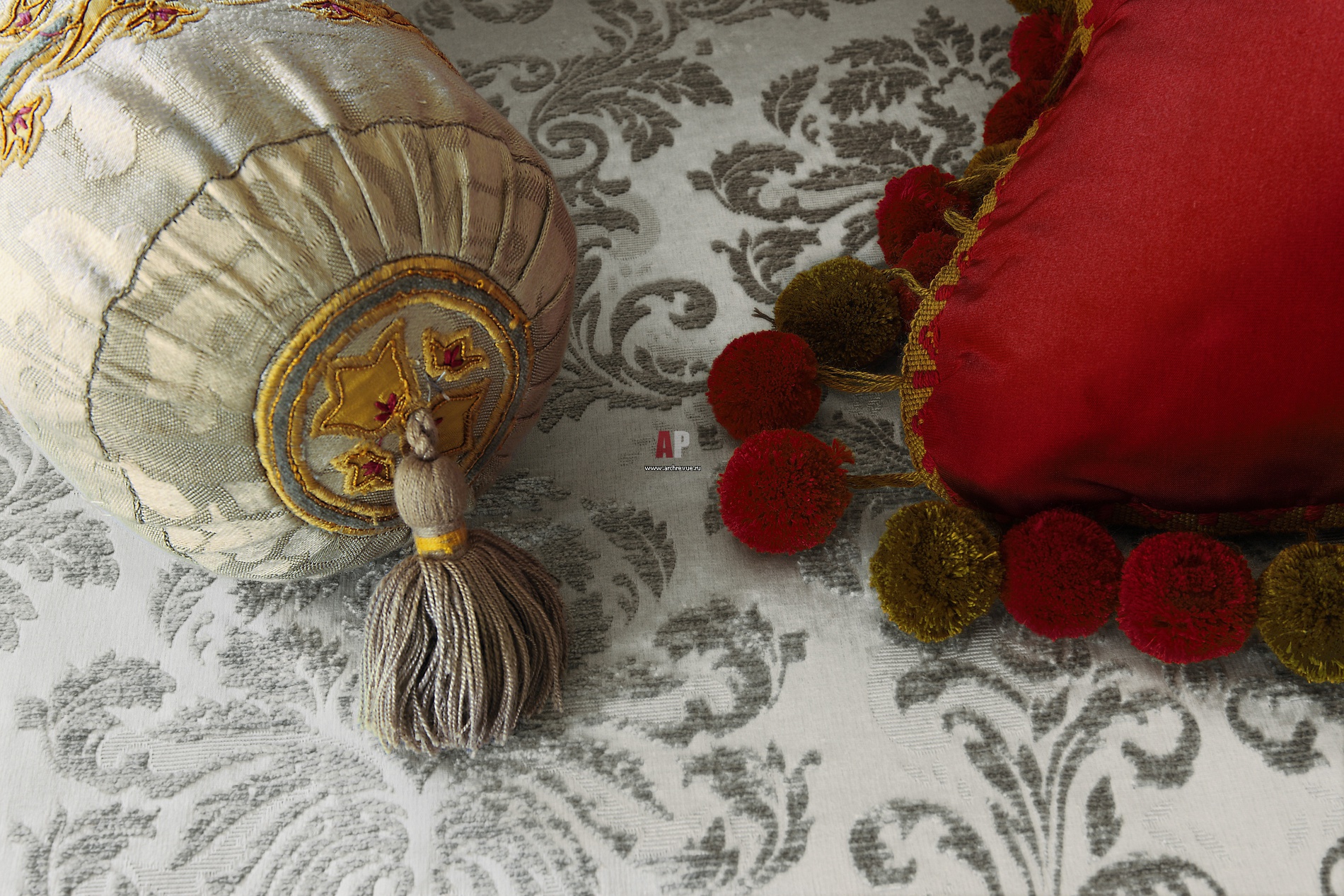 Фрагмент текстильного оформления гостиной. Весь интерьер квартиры строится на сочетании серебристо-золотистых и вишнево-красных тонов. Текстильный дизайн, «Пьемонтекс».
