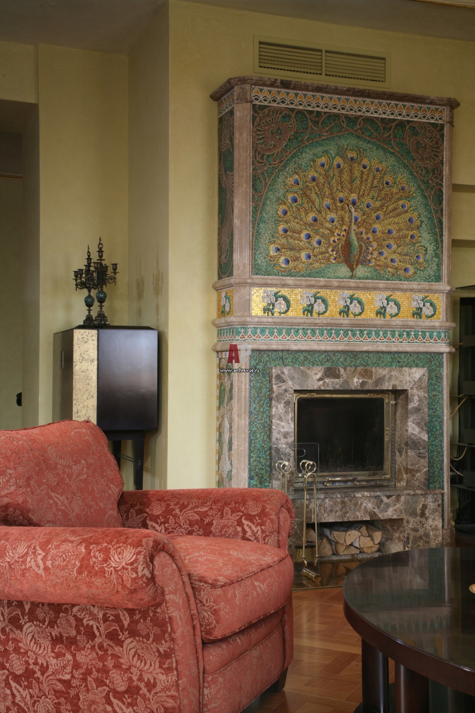 Камин украшен флорентийской мозаикой изумрудно-зеленого с золотом цвета. Авторская работа художников из мастерской «Артель».