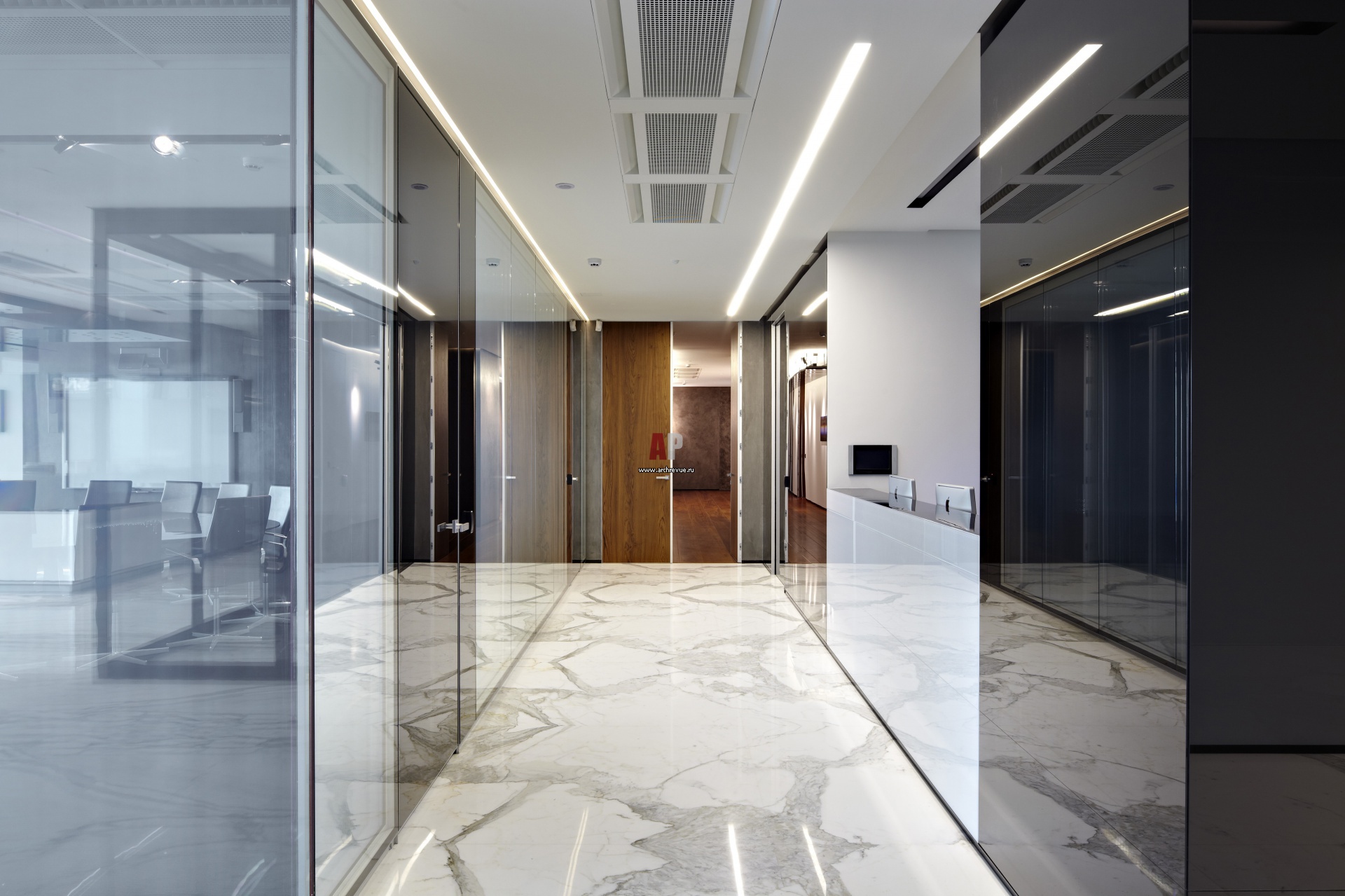 Цветовая палитра офиса строга и аскетична: в зоне топ-руководства компании к колористической тройке черный-белый-серый добавлен цвет натурального дерева.