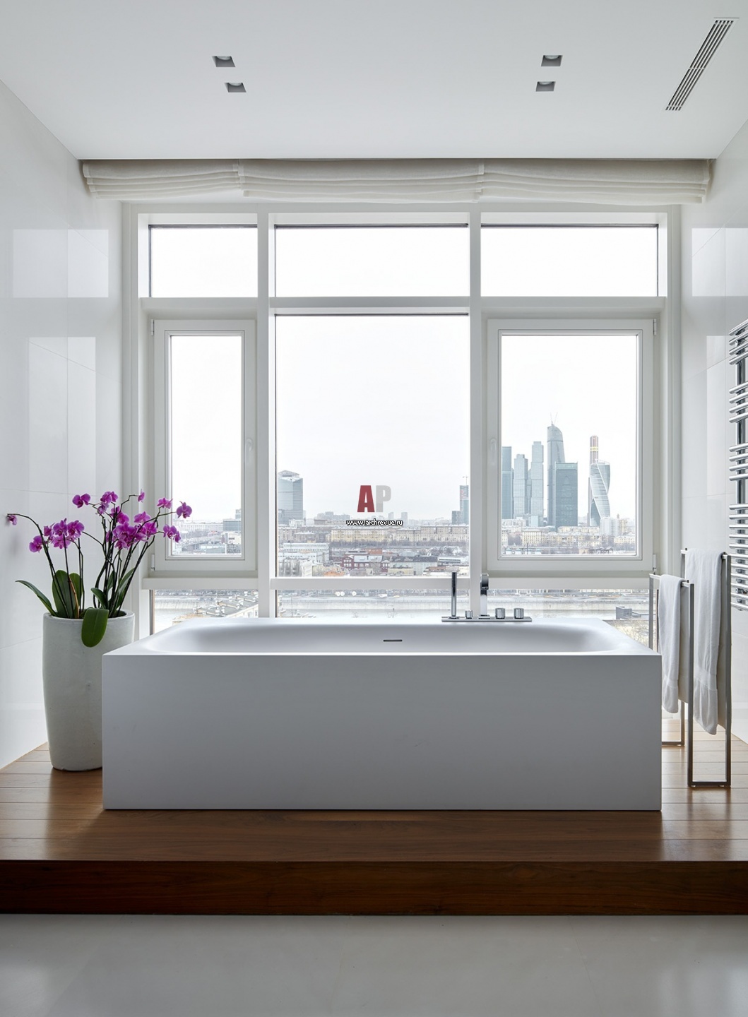 Ванна Antonio Lupi размещена на подиуме рядом с панорамным окном. Подиум выстлан тиковой доской.